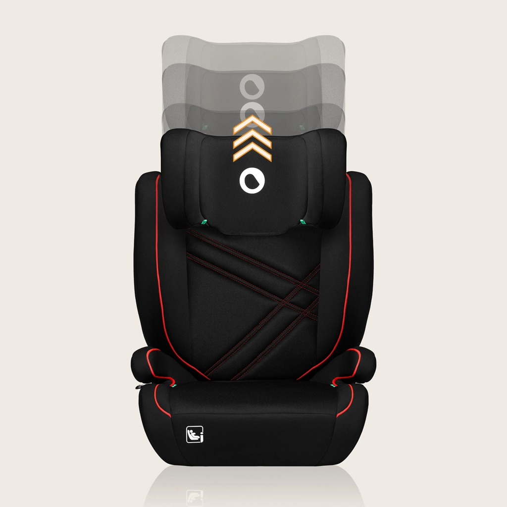 Large assise avec mousse EPE, panneaux en maille respirante et appui-tête à 8 positions garantissent le confort même lors de longs voyages. Les accoudoirs aident à guider correctement la ceinture.