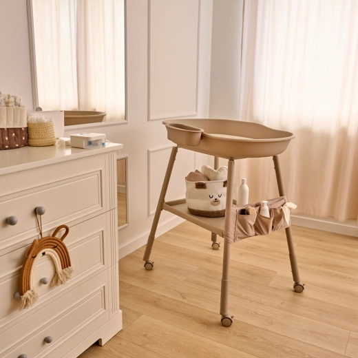 L’organisation devient un jeu d’enfant : un organisateur en tissu avec 5 poches, une grande étagère inférieure et un plateau latéral amovible gardent tout à portée de main. Les quatre roulettes avec freins permettent de déplacer la table sans effort là où vous en avez besoin – de la salle de bain à la chambre d’enfant et inversement.