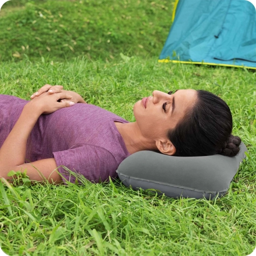 Le coussin se gonfle et se dégonfle facilement et, une fois plié, prend un minimum de place – il tient dans la poche d’un sac à dos. Parfait pour la tente, le train et l’avion.