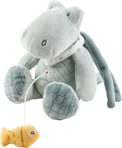 Adorable peluche musicale NATTOU en forme de crocodile Romeo, offrant à bébé un sentiment de sécurité, des câlins ultra doux et une berceuse La-Le-Lu apaisante. Grâce à ses nombreuses prises, elle favorise le développement du toucher et de la motricité et peut être fixée au lit pour un endormissement serein.