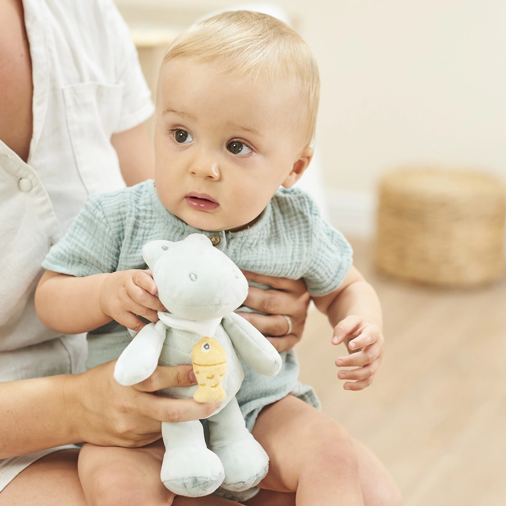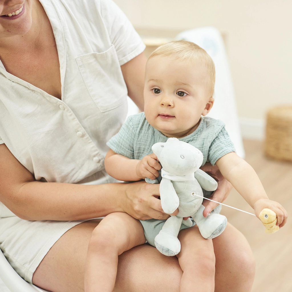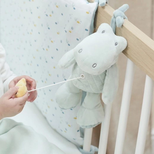 En tirant sur la ficelle, une douce berceuse La‑Le‑Lu se met à jouer, apaise bébé et l’aide à s’endormir plus facilement.
