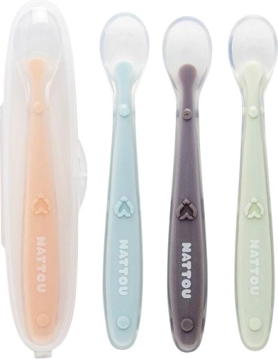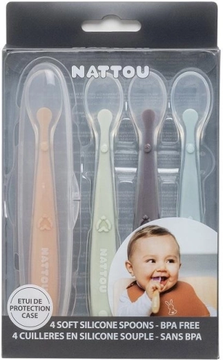 Pratique set de quatre cuillères pour enfants NATTOU pour nourrir confortablement bébés et tout-petits. Grâce à leur embout en silicone extra souple et flexible, elles sont douces pour les gencives sensibles, les manches ergonomiques facilitent la prise en main et le silicone 100 % résistant, sans BPA assure une utilisation sûre à la maison comme en déplacement.