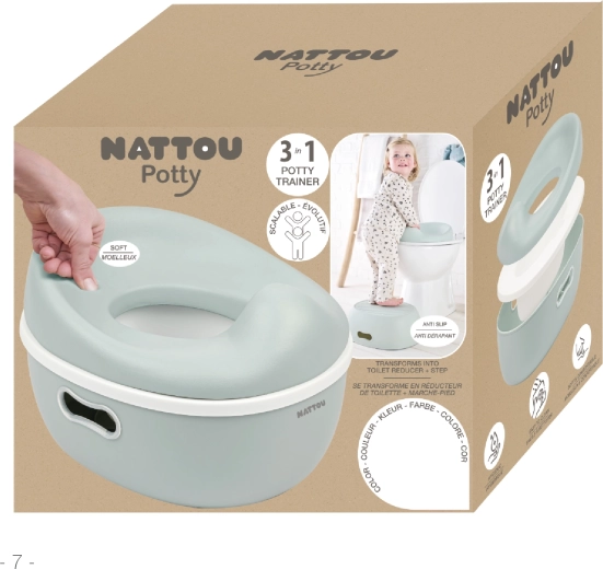 Le pot NATTOU Potty 3-en-1 est une solution intelligente pour chaque étape de l’apprentissage de la propreté. Il commence comme un pot compact avec une assise confortable et un bord avant relevé anti-éclaboussures. Quand l’enfant est prêt, utilisez simplement le réducteur pour toilette standard et le marchepied, qui apportent la hauteur et la stabilité nécessaires.