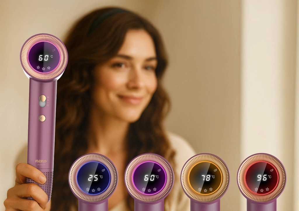 Neno Beauty Silvia allie technologie moderne et confort au quotidien. Grâce à l’ionisation avancée, il élimine l’électricité statique, referme les cuticules et laisse les cheveux lisses et brillants. Un capteur intelligent contrôle la température jusqu’à 100× par seconde pour protéger les cheveux de la surchauffe et des dommages. L’écran LED avec anneau coloré affiche clairement la température et la vitesse du flux d’air, pour garder le styling sous contrôle d’un seul coup d’œil.