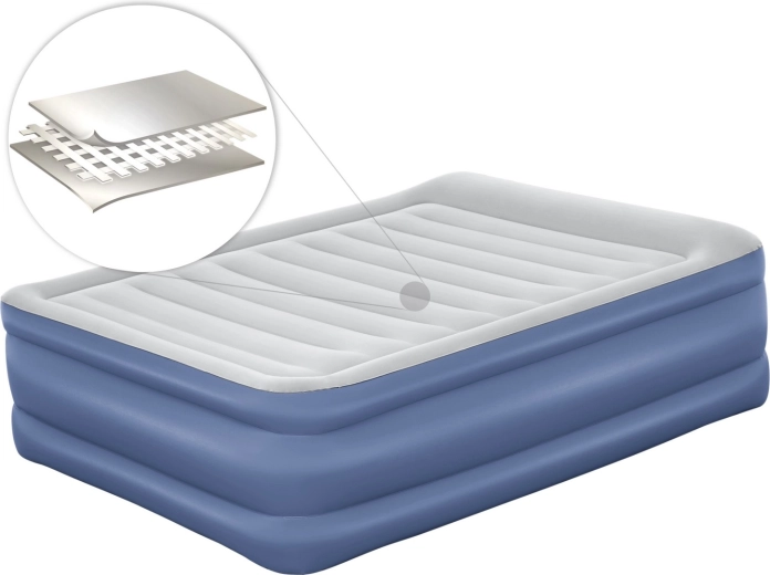Le TRITECH (PVC + couches renforcées) résistant minimise la perte de pression et prolonge la durée de vie. La pompe électrique intégrée 220–240 V gonfle et dégonfle le matelas rapidement et sans effort ; si nécessaire, vous pouvez également utiliser une pompe manuelle ou à pied classique. L’emballage comprend un sac de transport pour un transport facile et une rustine pour des réparations rapides.