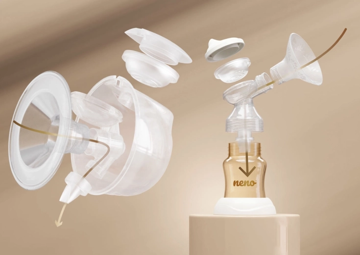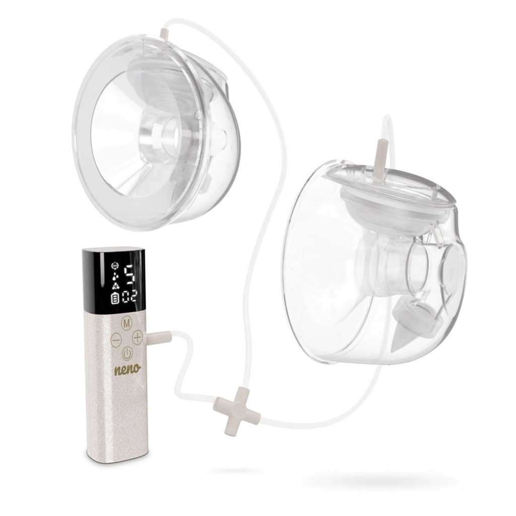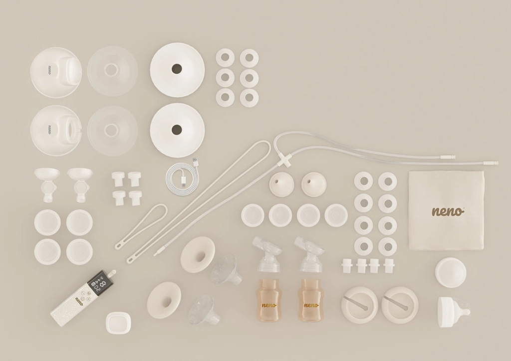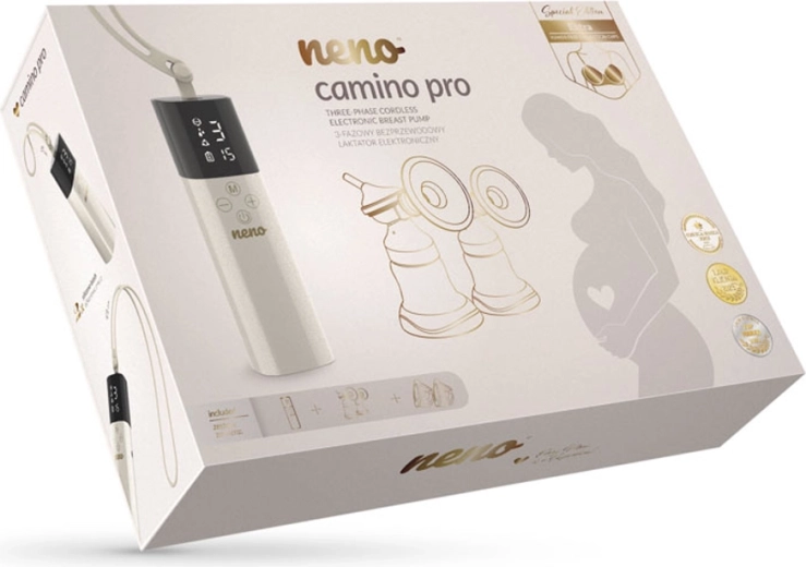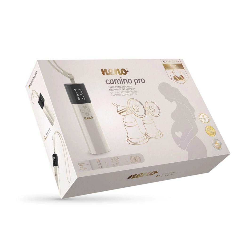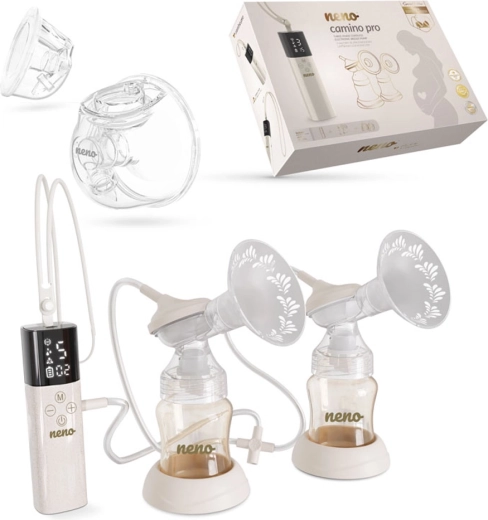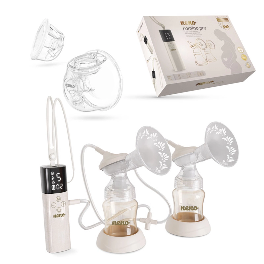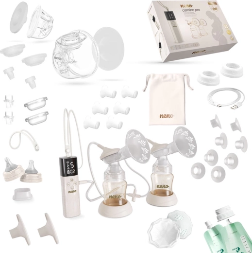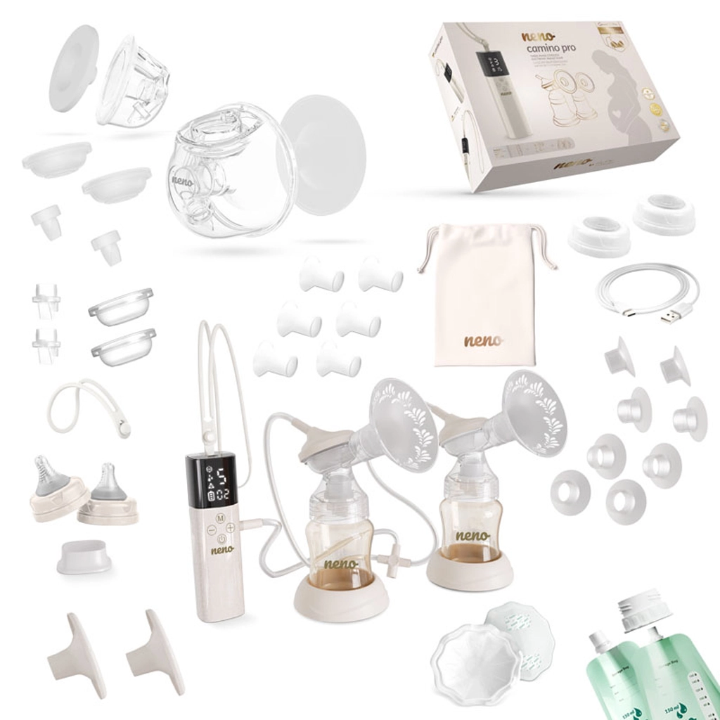 - Tire-lait Neno Camino Pro, support, câble USB‑C, étui en velours, 2× sachet de lait, 2× coussinets d’allaitement, 2× cordons (long et court) ; kit d’extraction en biberon (2× biberon 150 ml, 2× couvercle de coque, 2× coque 24 mm, 2× support, tube en silicone, 4× membrane, 4× valve, 2× connecteur, 2× jeu de réducteurs 15/17/19/22 mm, 2× bouchon de biberon avec connecteur) ; kit de collecte mains libres (2× contenant 240 ml, 2× connecteurs, 2× capots de membranes, 4× membranes, 2× coques 24 mm, 4× valves, 2× capots de coques, 2× jeux de réducteurs 17/19/21 mm)
