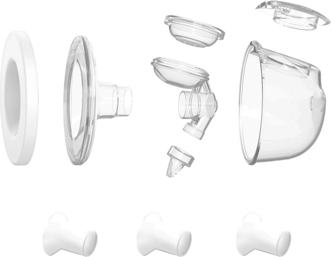 L’emballage comprend un kit complet pour l’extraction en biberon et la collecte mains libres dans des contenants discrets de 240 ml qui s’insèrent dans un soutien-gorge d’allaitement standard. Le système fermé protège le lait contre le reflux et la contamination. Grâce à un large choix de réducteurs de coques mammaires (jusqu’à 7 tailles), vous trouverez facilement un ajustement parfait sans pression ni inconfort.