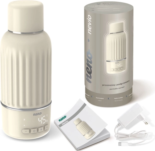 Nous présentons Neno Nevio – un chauffe-biberon portable compact qui assure un chauffage rapide et une régulation précise de la température de 35 à 55 °C avec une exactitude de 1 °C. Grâce à sa capacité de 500 ml, à son bec ergonomique et à son double joint, il est idéal à la maison comme en déplacement. Son couvercle pratique, qui sert également de verre, et sa charge rapide font de Nevio un allié fiable pour le lait et d’autres boissons.