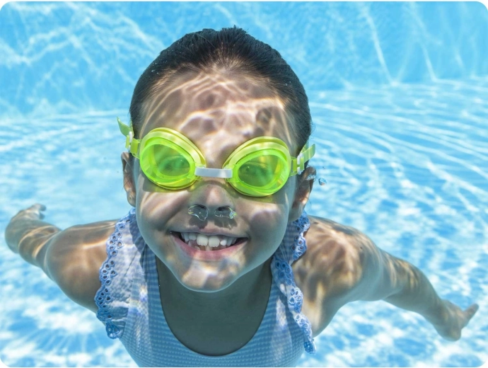 Les lunettes de natation pour enfants Bestway, légères et confortables, en vert, offrent une vision claire sous l’eau et une protection grâce à des verres résistants aux UV. La sangle en silicone souple est entièrement ajustable pour un maintien sûr et confortable, sans latex – idéal pour les enfants à partir de 7 ans.