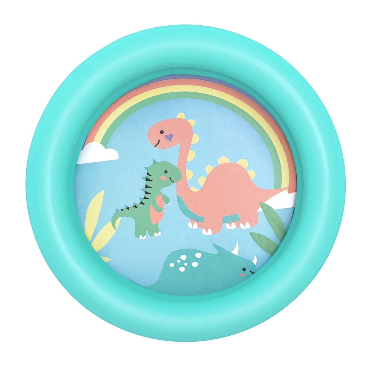 La stabilité est assurée par 2 anneaux d’air robustes qui maintiennent la forme et préviennent le basculement. Les parois et le fond souples offrent du confort pour jouer et s’asseoir, tandis que l’imprimé coloré de dinosaures transforme chaque éclaboussure en aventure amusante. Elle peut aussi être utilisée sans eau : versez des balles à l’intérieur et vous obtenez instantanément un coin de jeu intérieur.