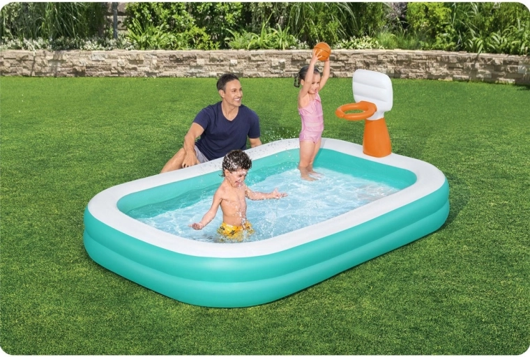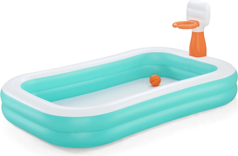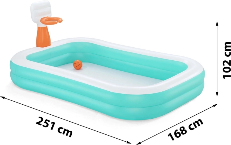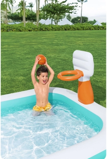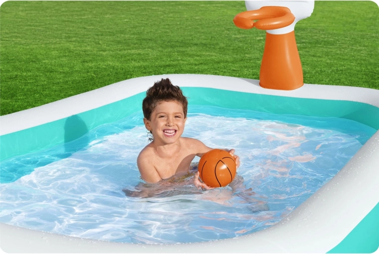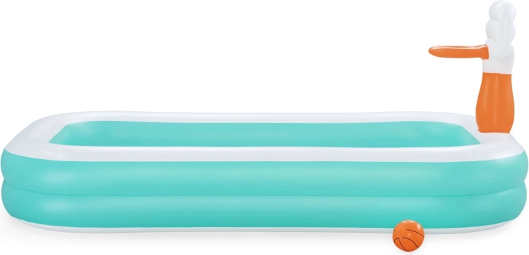 La piscine familiale gonflable BESTWAY Dunk ‘N’ Splash allie rafraîchissement et jeu actif. Le panier intégré avec ballon orange transforme chaque bain rafraîchissant en un défi amusant de tirs au panier. Grâce à ses parois larges et souples et à ses deux chambres à air indépendantes, la piscine est stable et confortable pour petits et grands.