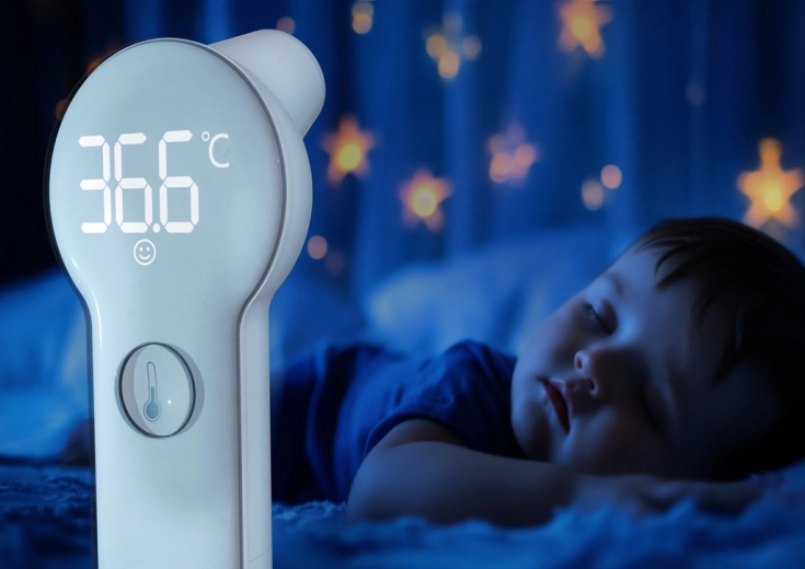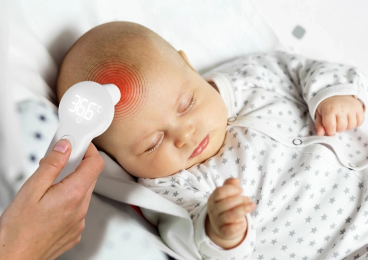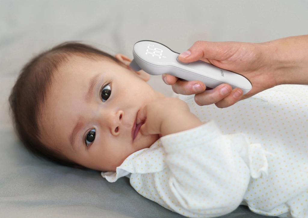 De grands chiffres lumineux se lisent facilement même dans l’obscurité. La mesure douce et sans contact ne réveille pas un enfant endormi.