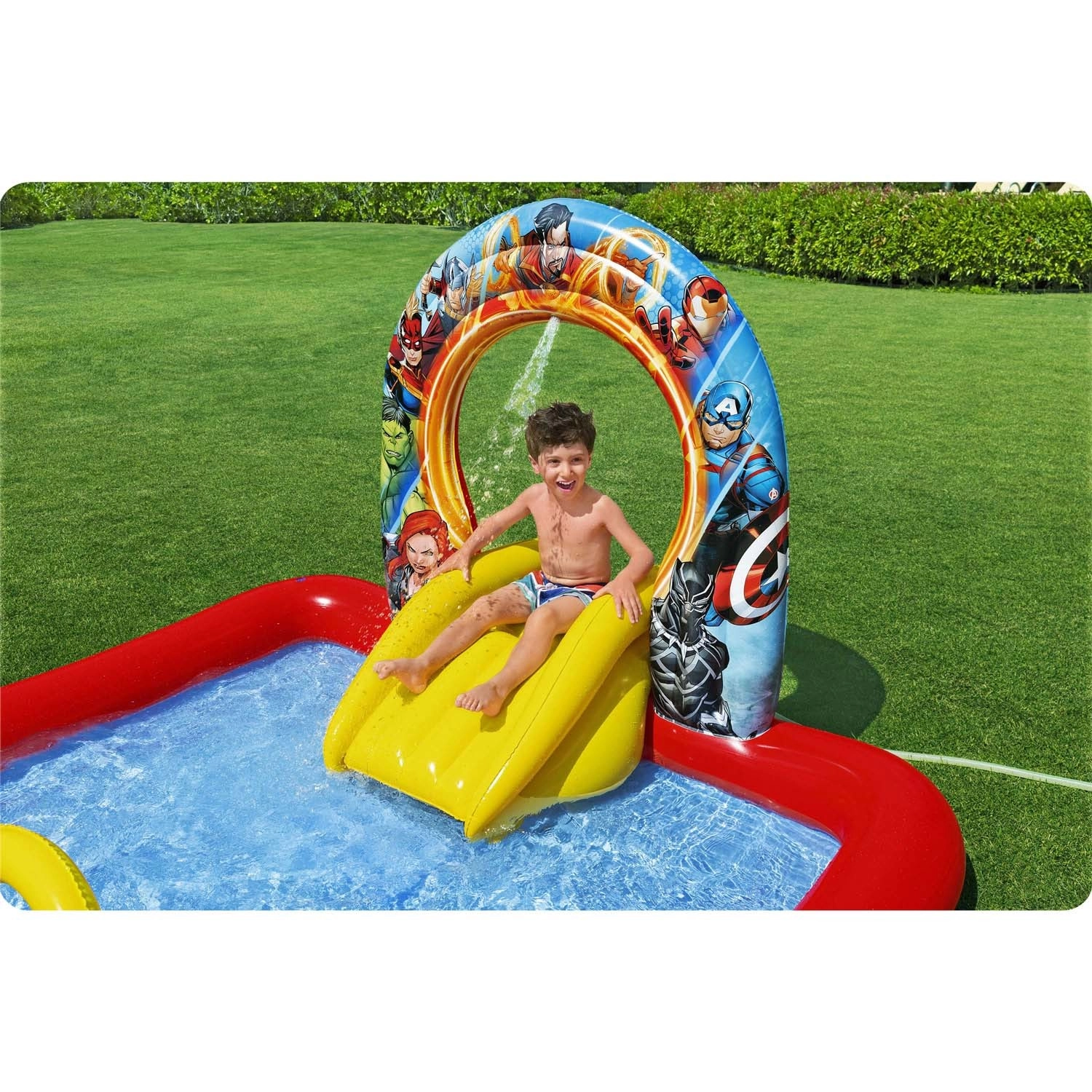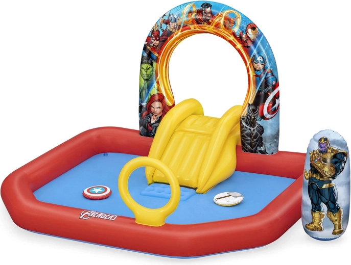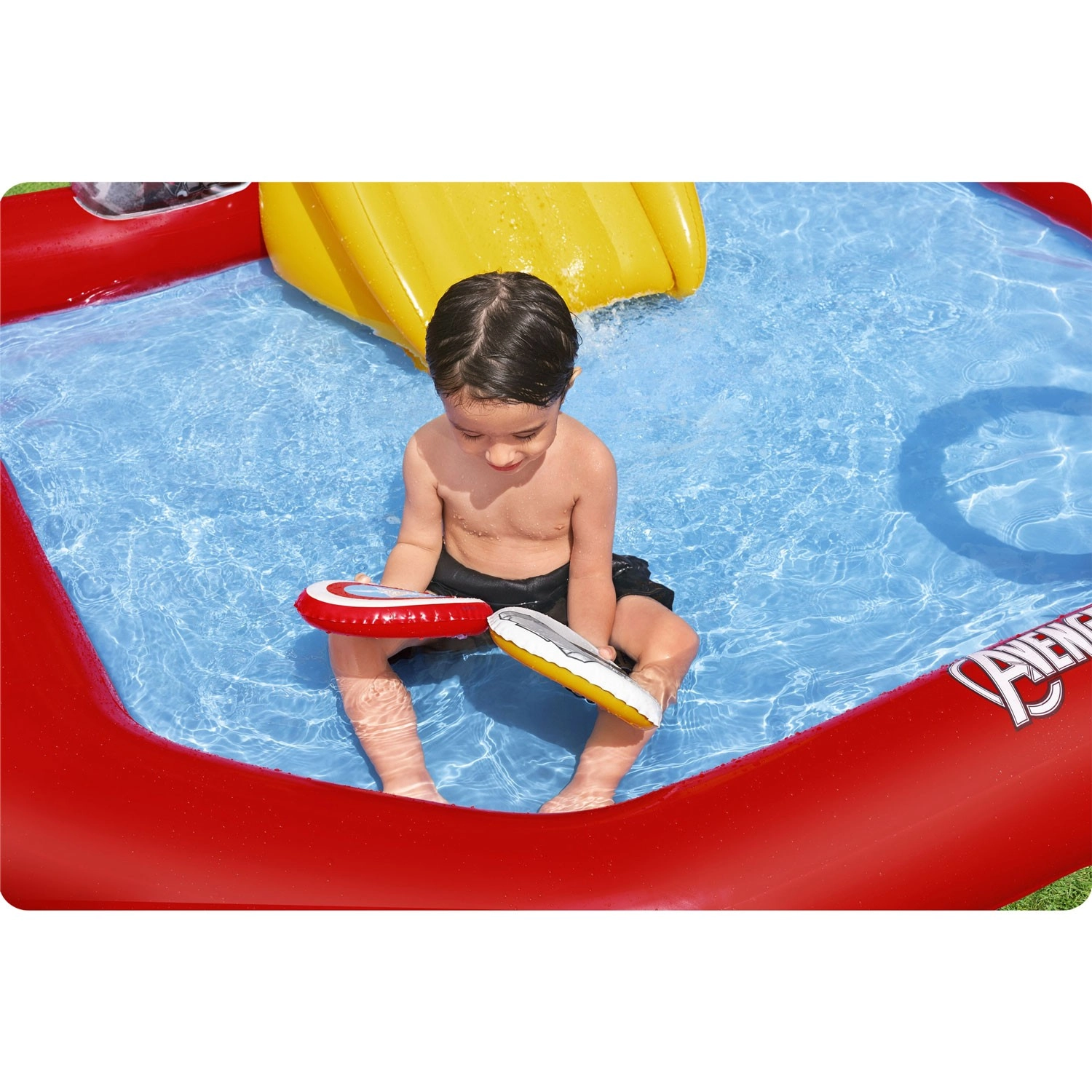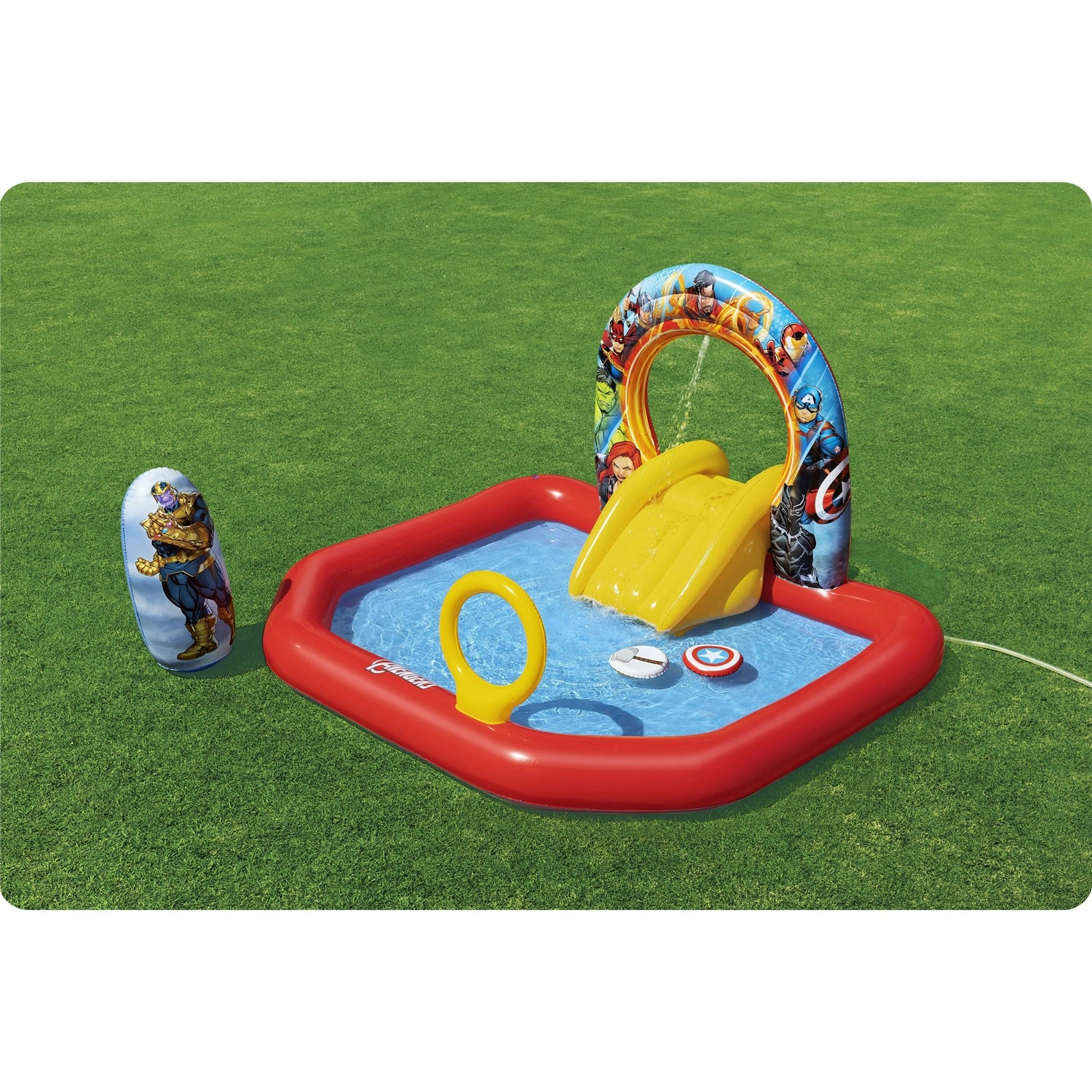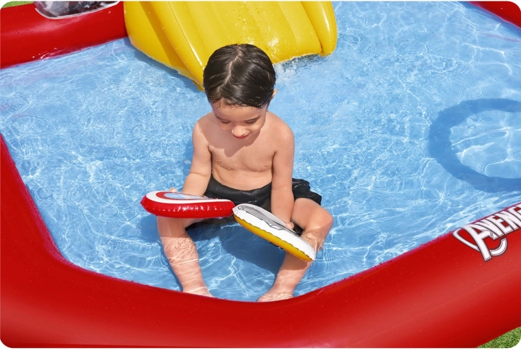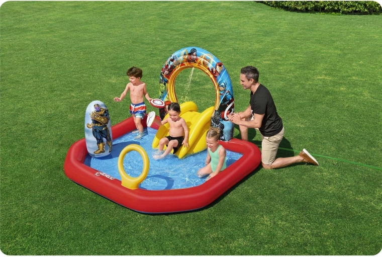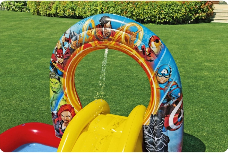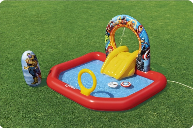 De multiples activités attendent les enfants : une glissade jaune vers l’eau peu profonde, le lancer d’anneaux sur des cibles et le Thanos auto-redressant pour entraîner réflexes et coordination. Les graphismes colorés des héros encouragent le mouvement et le jeu interactif en plein air.