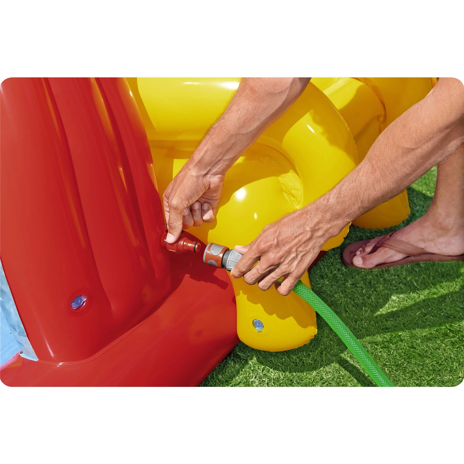 Branchez un tuyau d’arrosage et transformez l’arche au motif de super-héros en un jet rafraîchissant pour glisser et jouer pendant les journées chaudes.