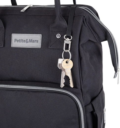 La disposition bien pensée propose 11 poches facilement accessibles, dont 2 poches isothermes pour maintenir la température des biberons, une poche étanche pour les vêtements mouillés ou les lingettes, une poche extérieure pour bouteille et une poche extérieure pour lingettes humides. On retrouve aussi une lanière porte-clés, un accès zippé à l’arrière pour un accès rapide et une sangle pour glisser sur la poignée de valise en voyage.