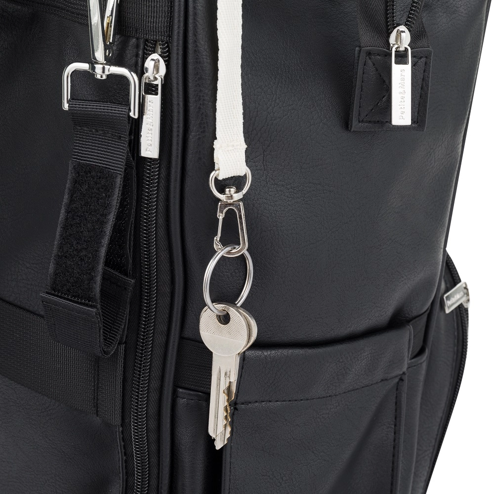 Agencement intérieur clair, poche séparée pour tablette, ouverture pour lingettes humides et cordon porte-clés pour un accès rapide aux indispensables.