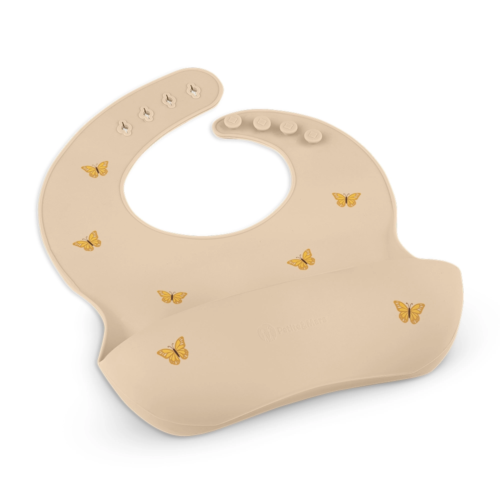 Le bavoir en silicone Petite&Mars Take&Match en teinte sable, orné de délicats motifs de papillons, est l’allié idéal pour les premières purées comme pour l’alimentation autonome. Sa forme ergonomique et son silicone souple s’adaptent agréablement au cou de l’enfant, tandis que la poche profonde capte efficacement les aliments qui tombent et garde les vêtements propres.