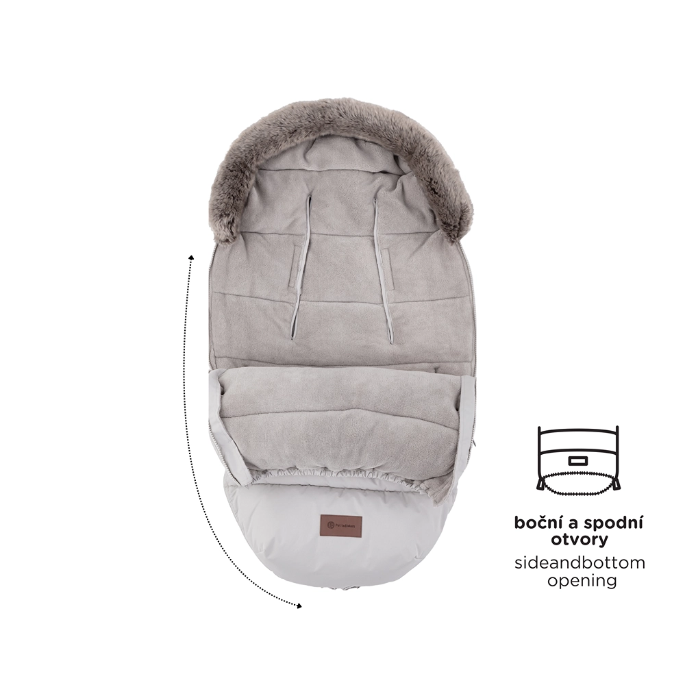 Des zips périphériques bien pensés permettent de détacher complètement la partie supérieure, d’aérer et de créer un coussin/insert séparé à partir de la partie inférieure. Dans la partie inférieure, les zips forment une ouverture pratique pour les pieds. Une poche arrière courbée antidérapante aide à maintenir la chancelière bien en place et la fausse fourrure amovible facilite l’entretien.