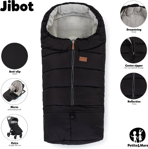 La chancelière 3‑en‑1 PETITE&MARS Jibot Horizontal Ink Black est conçue pour un confort maximal des enfants dès la naissance jusqu’à env. 3 ans. Grâce à sa couche extérieure déperlante et coupe‑vent avec colonne d’eau de 1000 mm et sa douce doublure en polaire, votre enfant reste au chaud et au sec même par mauvais temps. Les fentes horizontales pour harnais permettent d’enfiler les sangles sans avoir à les démonter, ce qui augmente la compatibilité avec des poussettes et sièges auto de différentes marques.
