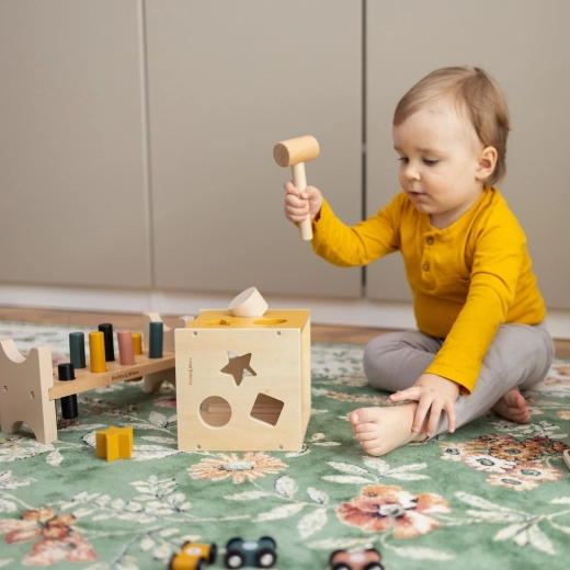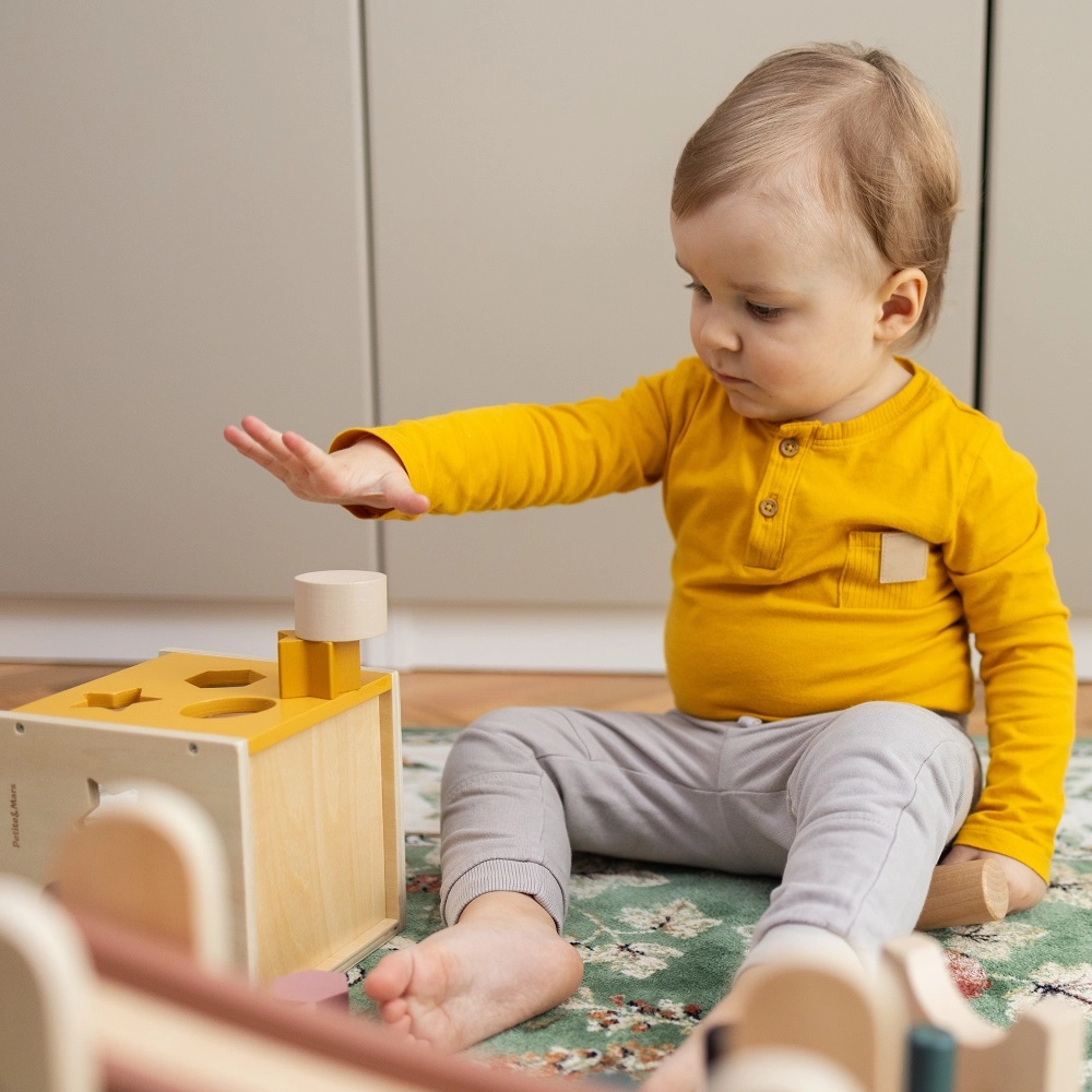 Le couvercle supérieur coulissant permet de vider rapidement les pièces et de revenir au jeu en toute fluidité. Le cube possède quatre faces de tri et des bords soigneusement polis pour une prise en main sûre, même par les plus petites mains. Le jouet s’intègre joliment dans la chambre d’enfant et fonctionne aussi comme matériel d’apprentissage polyvalent inspiré Montessori.
