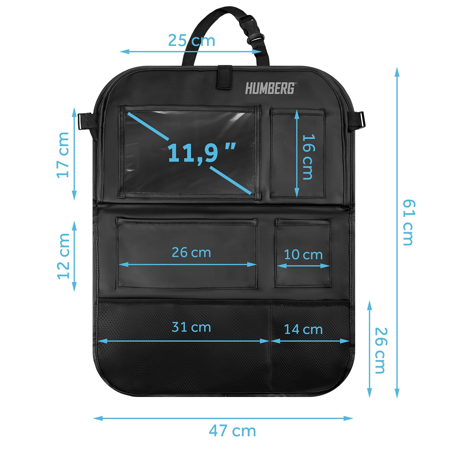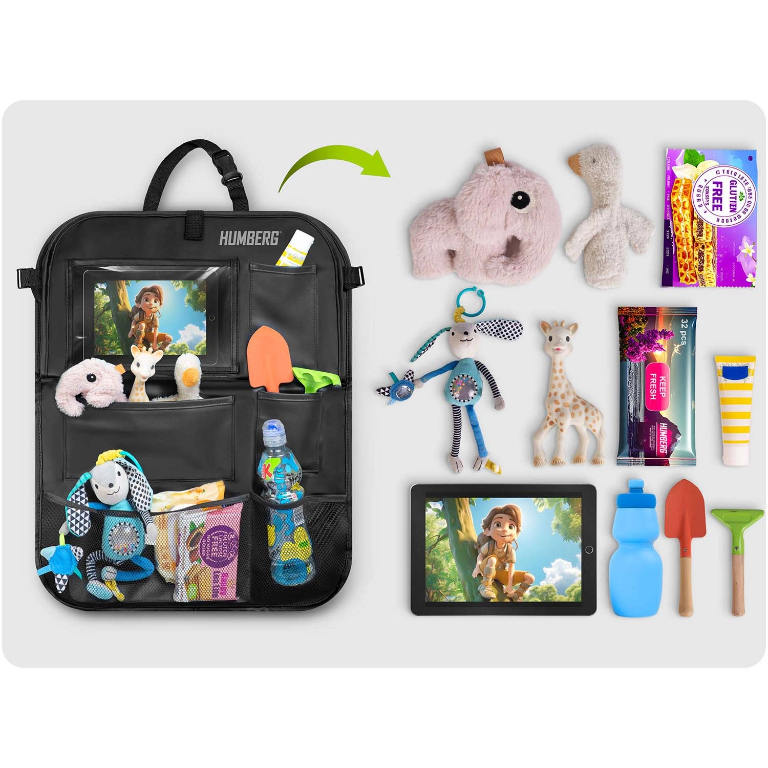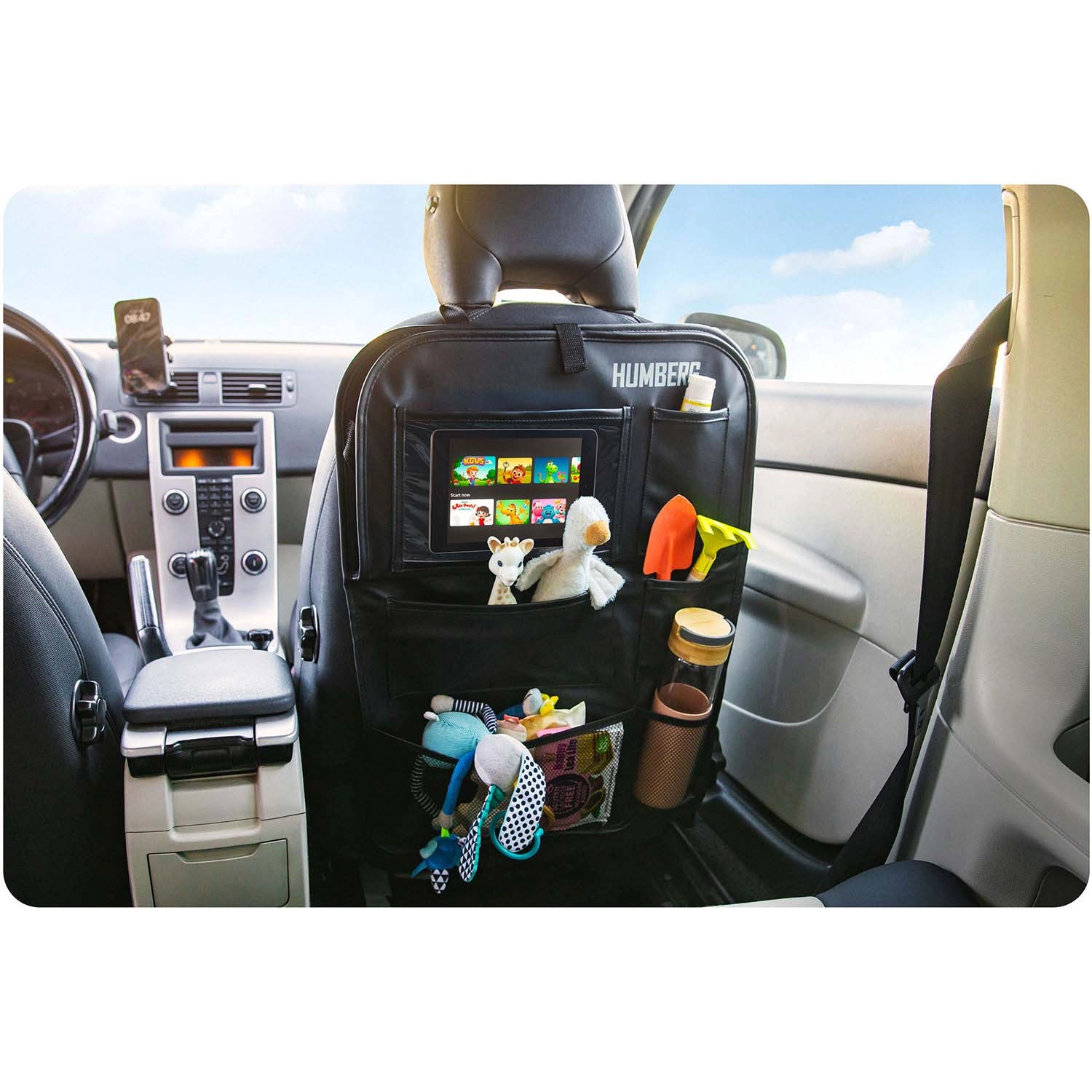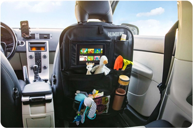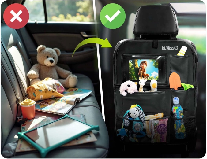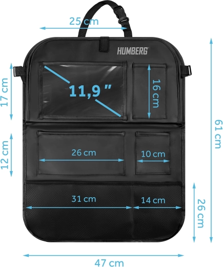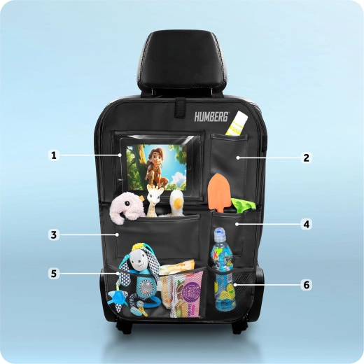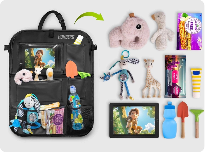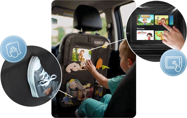 Gardez la voiture ordonnée et les trajets avec enfants plus sereins grâce à l’organiseur HUMBERG pour le dos de siège. Il offre une poche transparente pour tablette avec film tactile, une tablette rabattable pour le goûter ou le dessin, un porte-bouteille et plusieurs poches spacieuses pour jouets et petits objets. Montage facile, matériau facile à nettoyer et protection de la sellerie contre la saleté des chaussures.