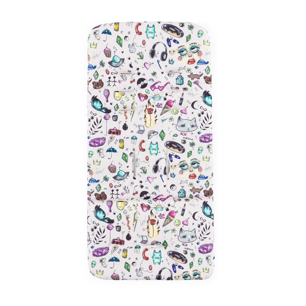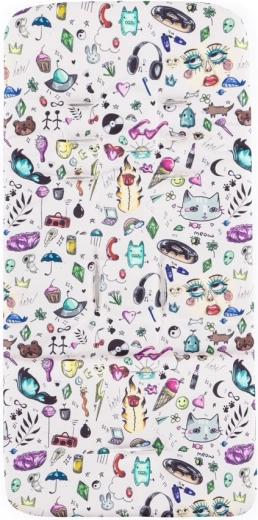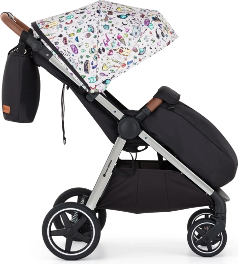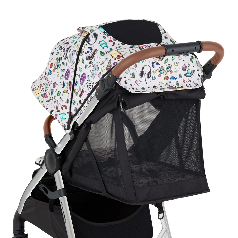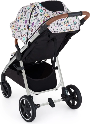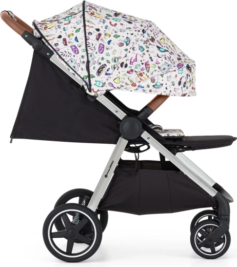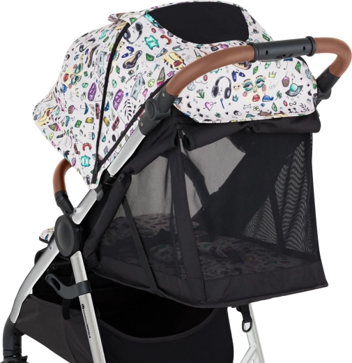 - châssis, roues avant et arrière pleines, housse de siège, sac à langer, chancelière noire, auvent, insert de poussette motif Tattoo, rembourrage en 3 pièces