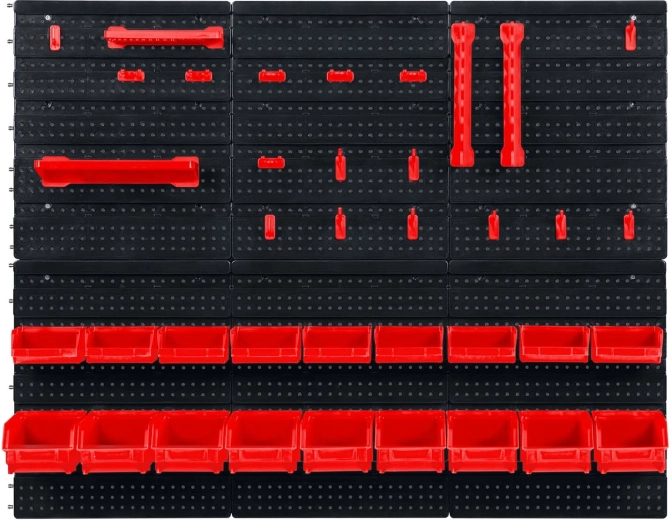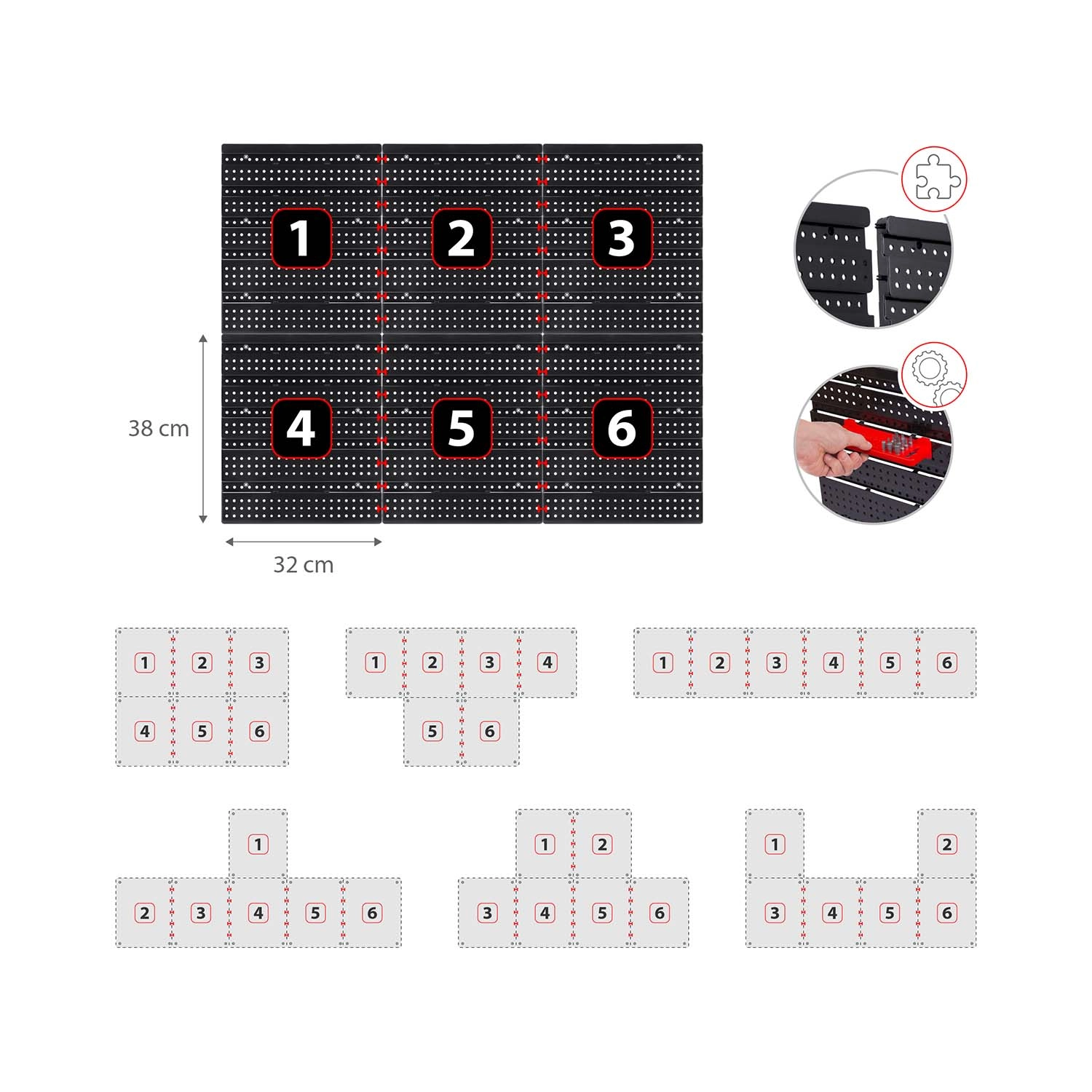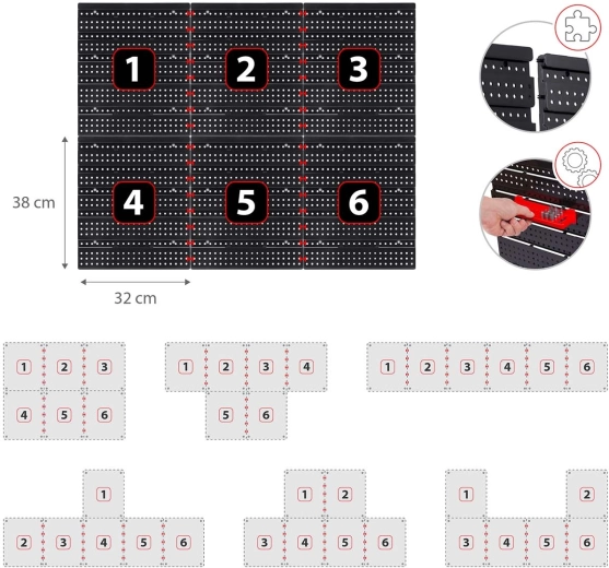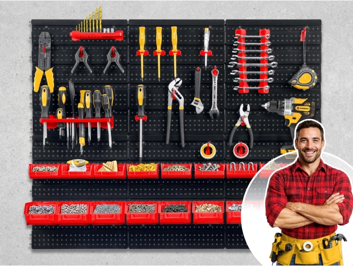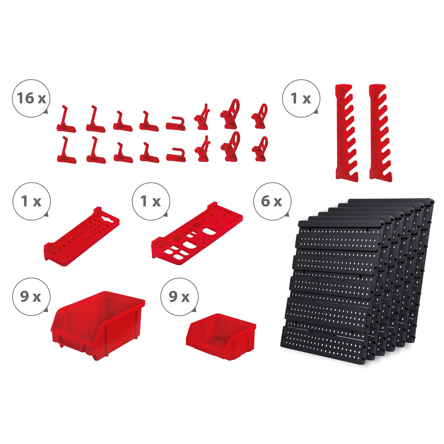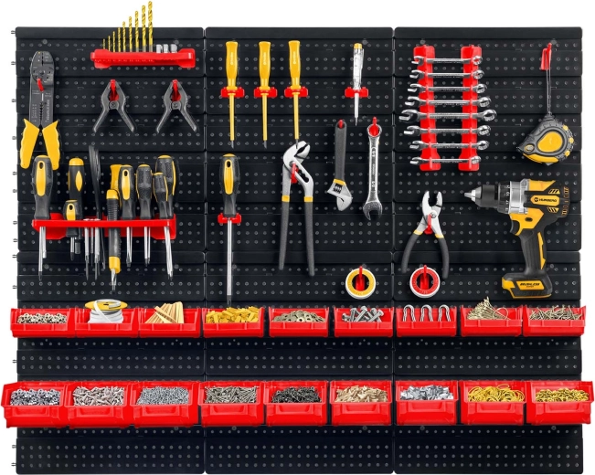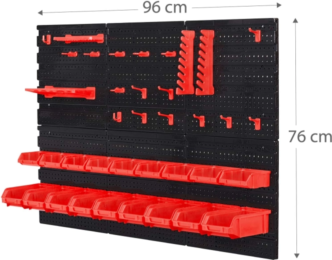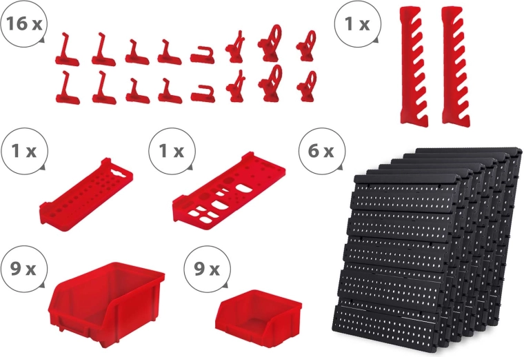 Le set comprend un large éventail d’accessoires : 6 panneaux modulaires et au total 43 éléments – 18 bacs (9 petits 9,5 × 10 × 5 cm et 9 grands 16 × 10 × 7,3 cm), 2 étagères de dépose (23 × 9 cm et 17 × 5 cm), 16 crochets et supports et 1 jeu de supports pour clés. Des chevilles universelles pour montage sur béton, brique, bois et tôle sont incluses.