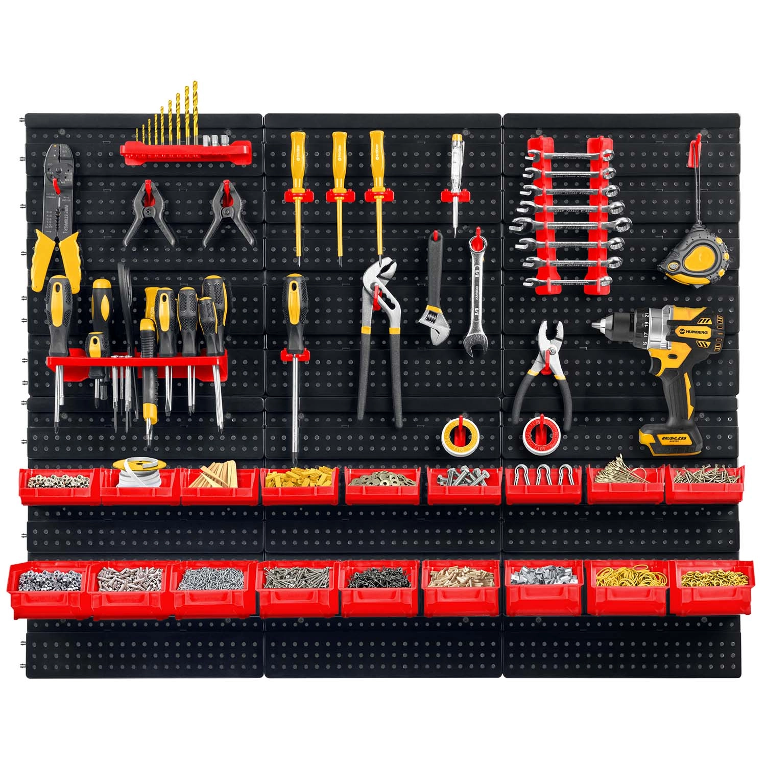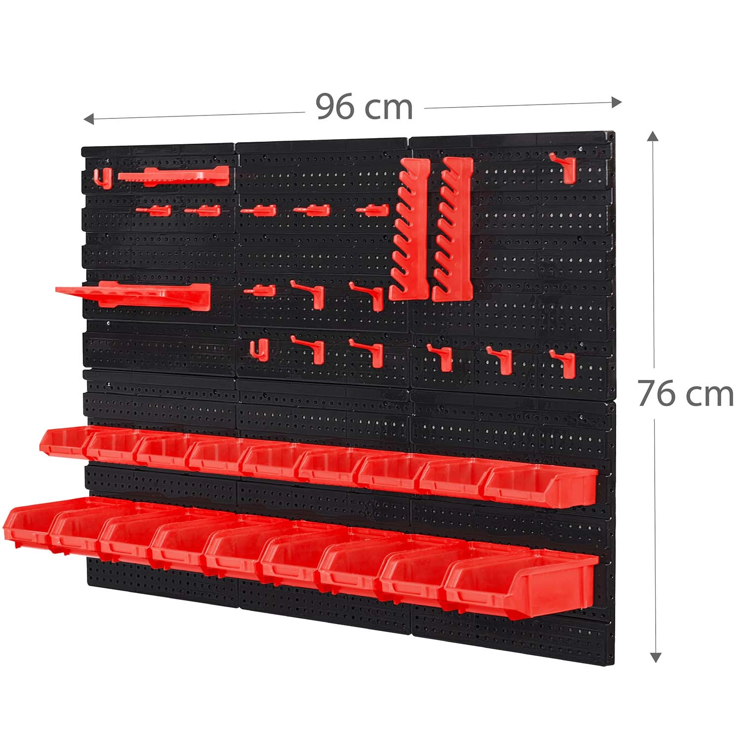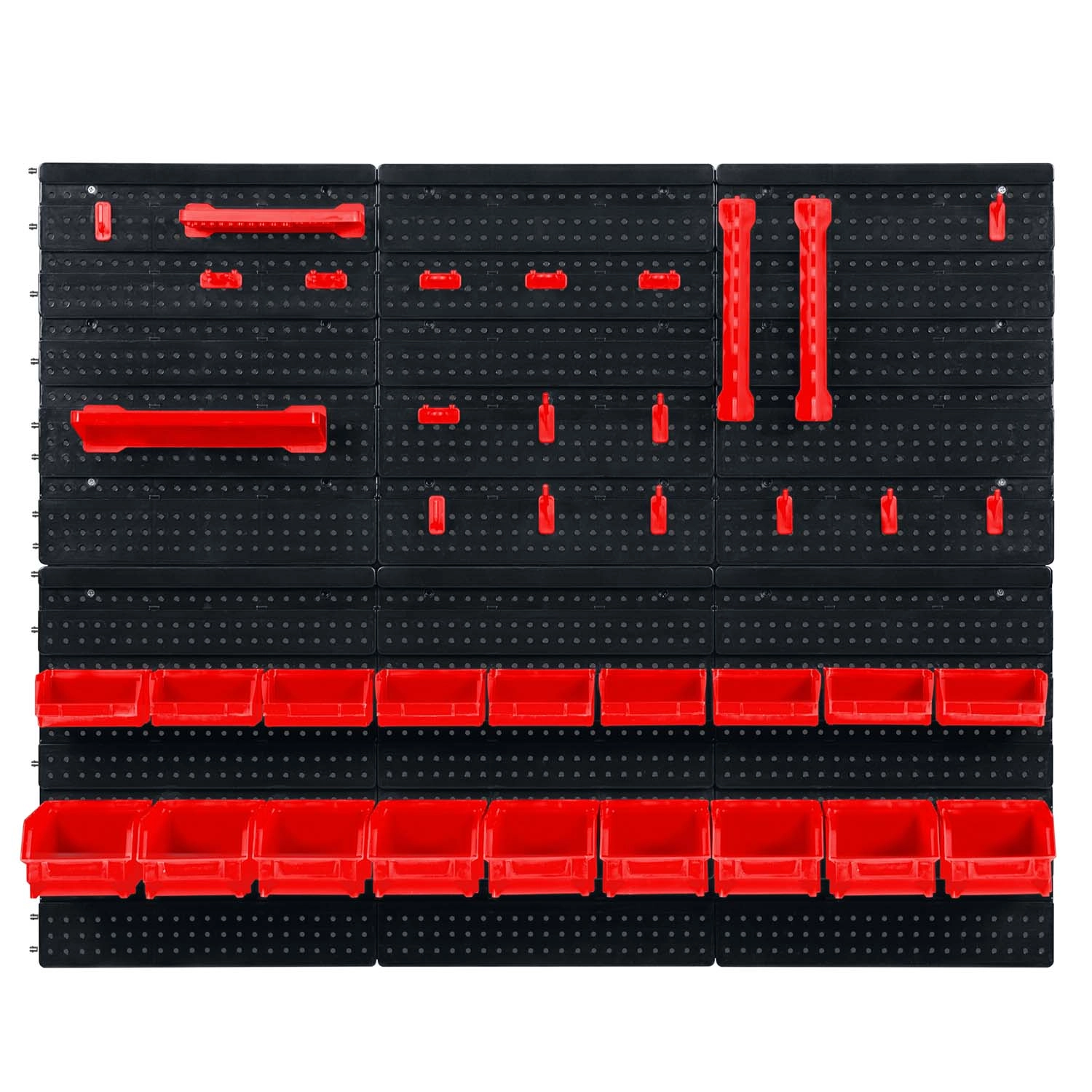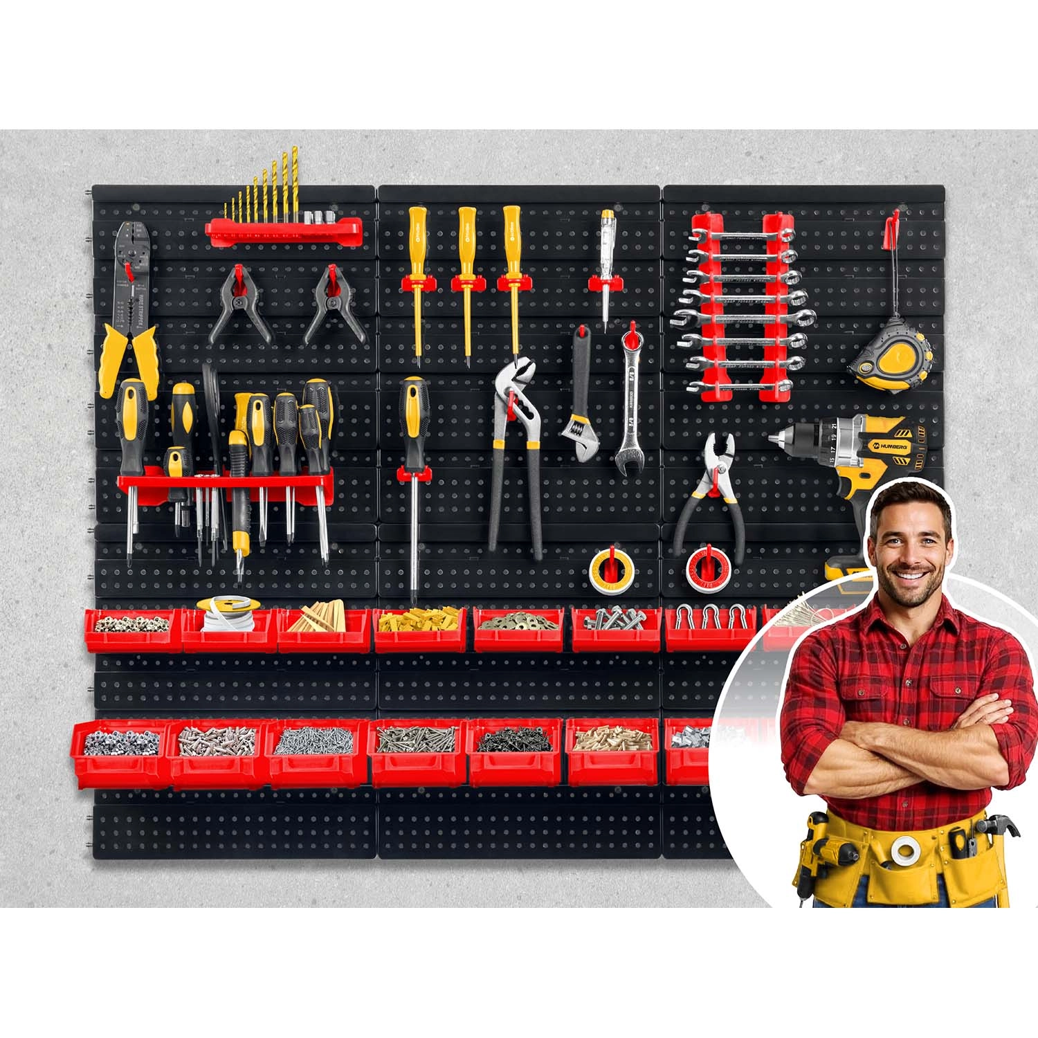 Le set comprend un large éventail d’accessoires : 6 panneaux modulaires et au total 43 éléments – 18 bacs (9 petits 9,5 × 10 × 5 cm et 9 grands 16 × 10 × 7,3 cm), 2 étagères de dépose (23 × 9 cm et 17 × 5 cm), 16 crochets et supports et 1 jeu de supports pour clés. Des chevilles universelles pour montage sur béton, brique, bois et tôle sont incluses.