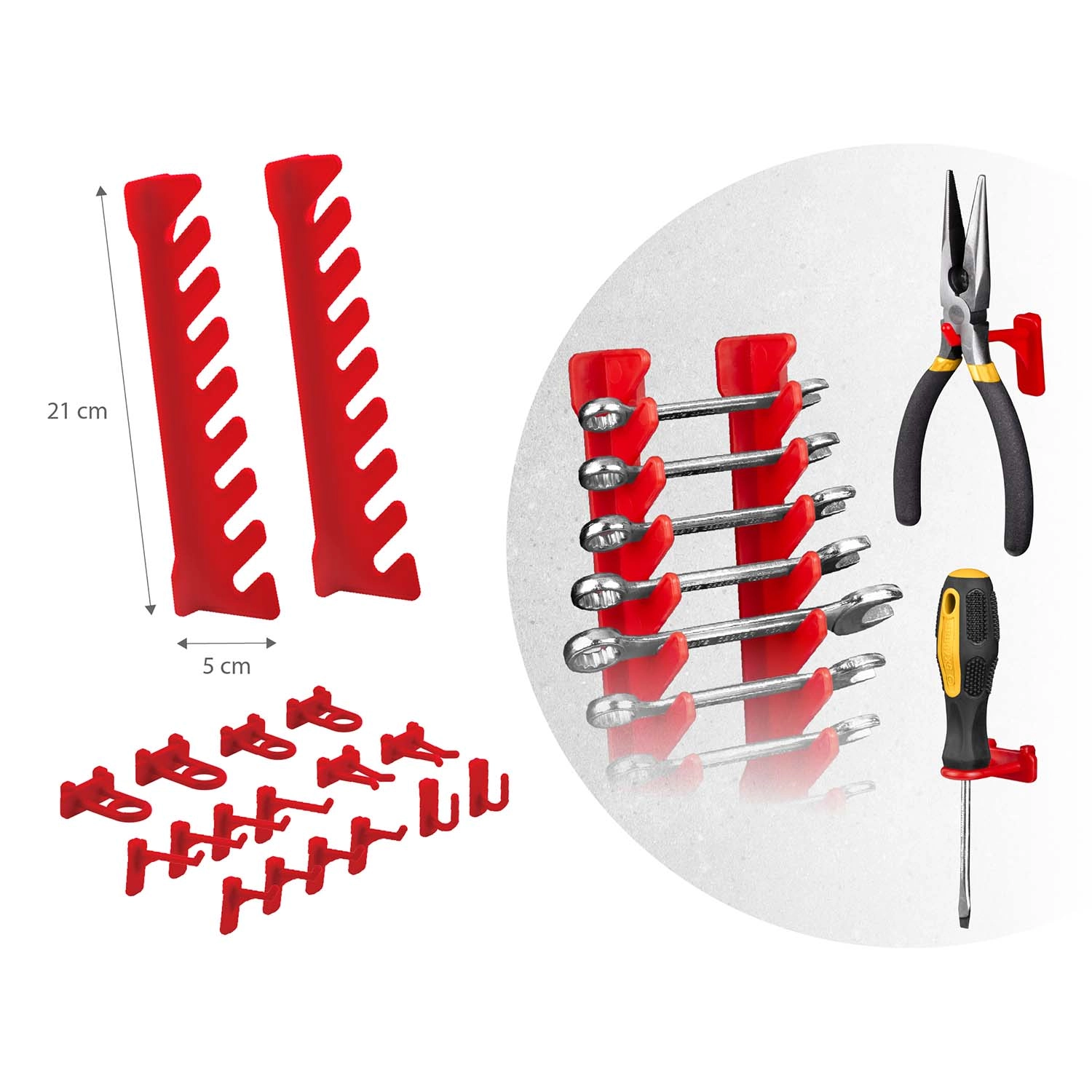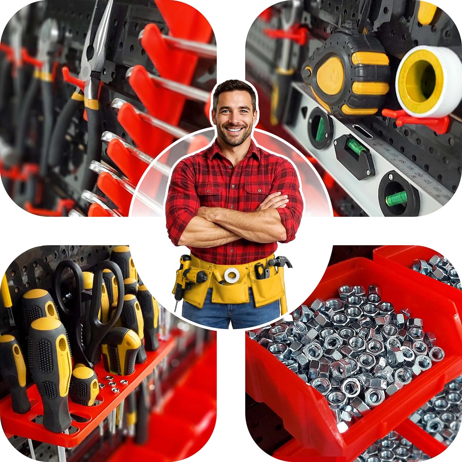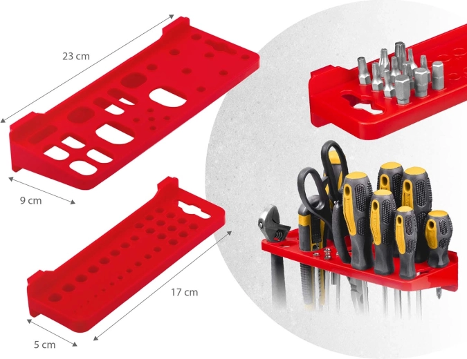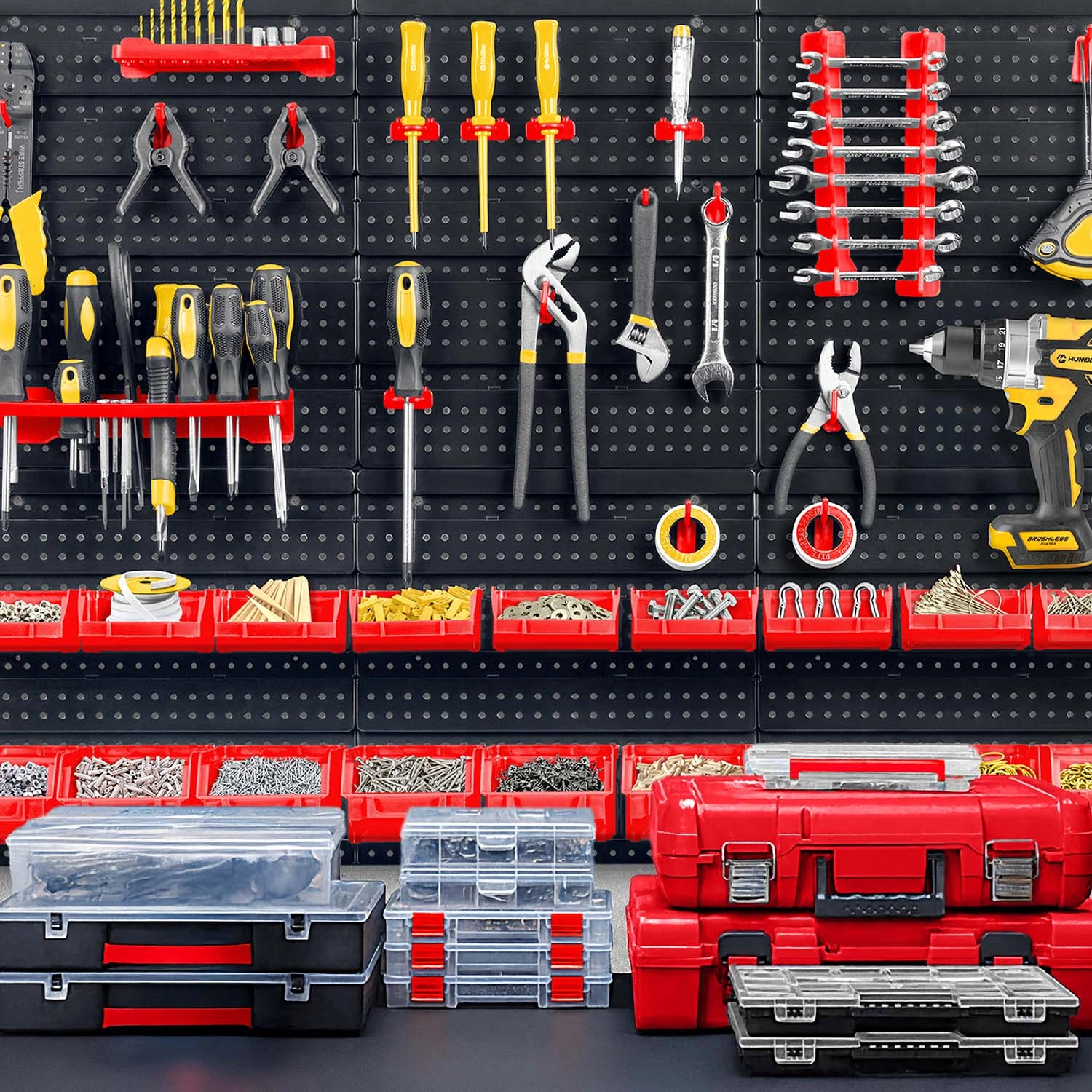 Le set comprend un large éventail d’accessoires : 6 panneaux modulaires et au total 43 éléments – 18 bacs (9 petits 9,5 × 10 × 5 cm et 9 grands 16 × 10 × 7,3 cm), 2 étagères de dépose (23 × 9 cm et 17 × 5 cm), 16 crochets et supports et 1 jeu de supports pour clés. Des chevilles universelles pour montage sur béton, brique, bois et tôle sont incluses.