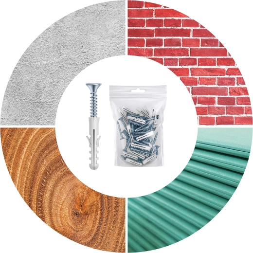 Le pack comprend des chevilles universelles et des vis pour le montage sur béton, brique, bois et tôle. Installation rapide et fixation stable.