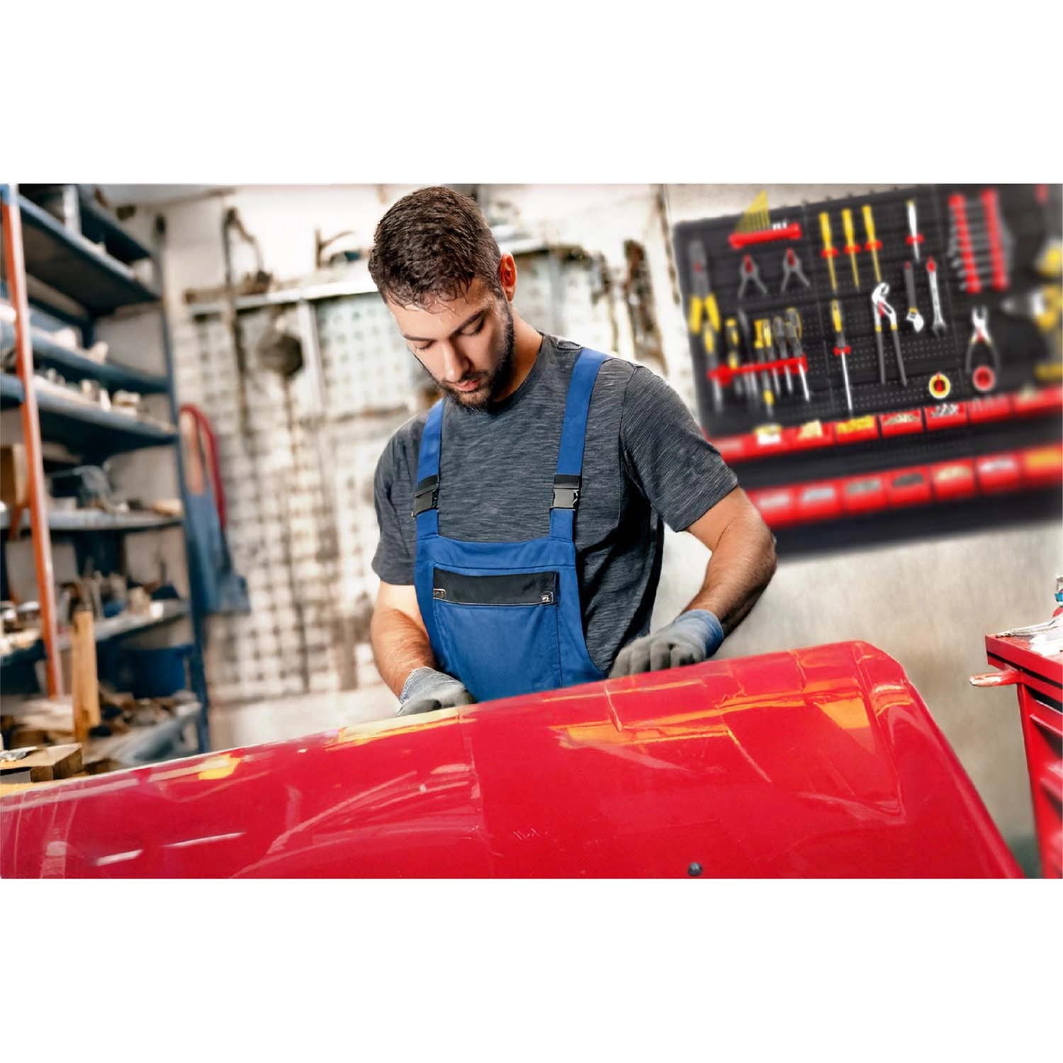 Six panneaux perforés et 43 accessoires vous permettent d’organiser vos outils exactement selon vos habitudes – des pinces et tournevis jusqu’aux forets et embouts.