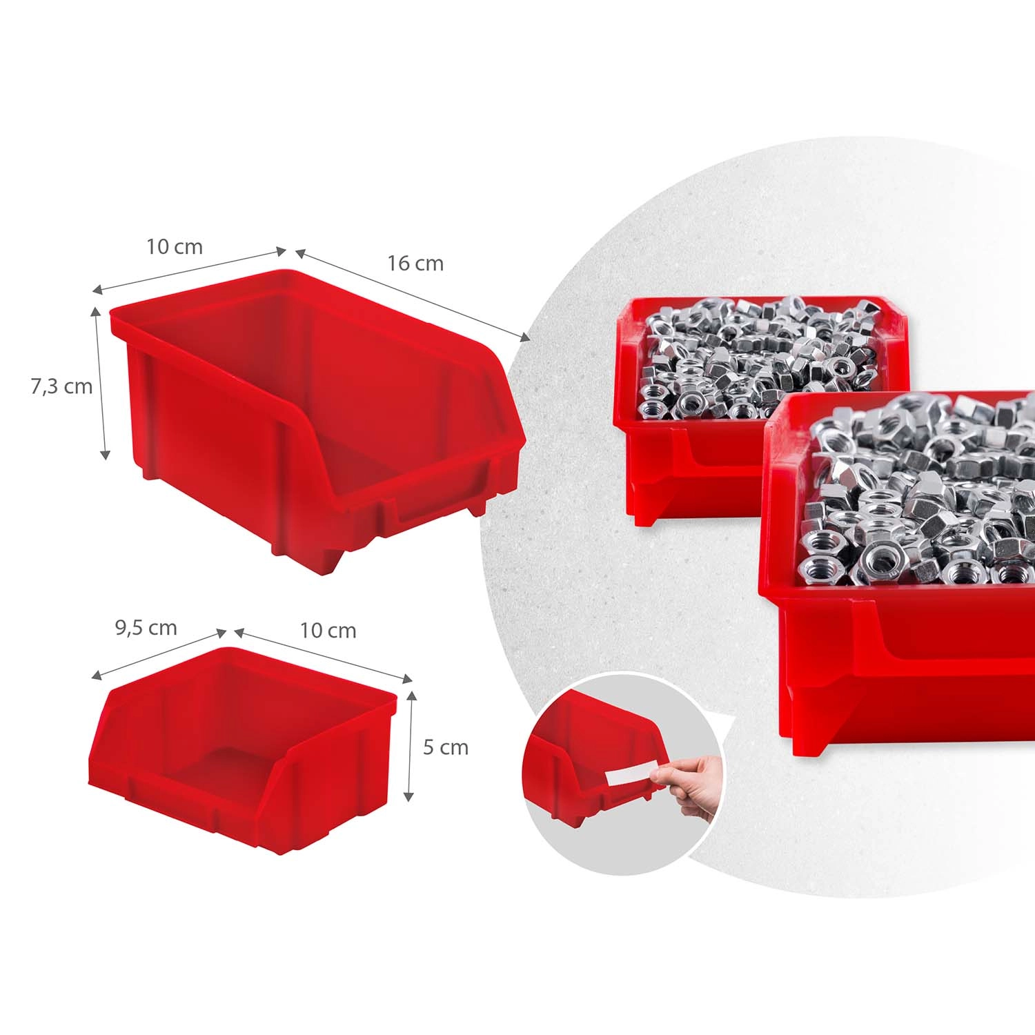 18 bacs en deux tailles, deux étagères de dépose et un jeu de crochets et de supports assurent un tri clair de la visserie ainsi qu’un rangement sûr des outils.