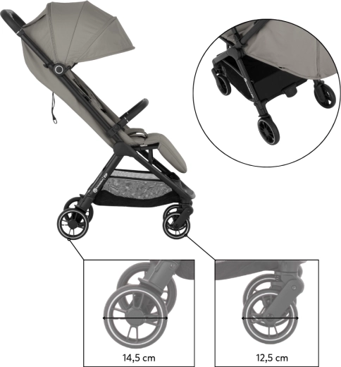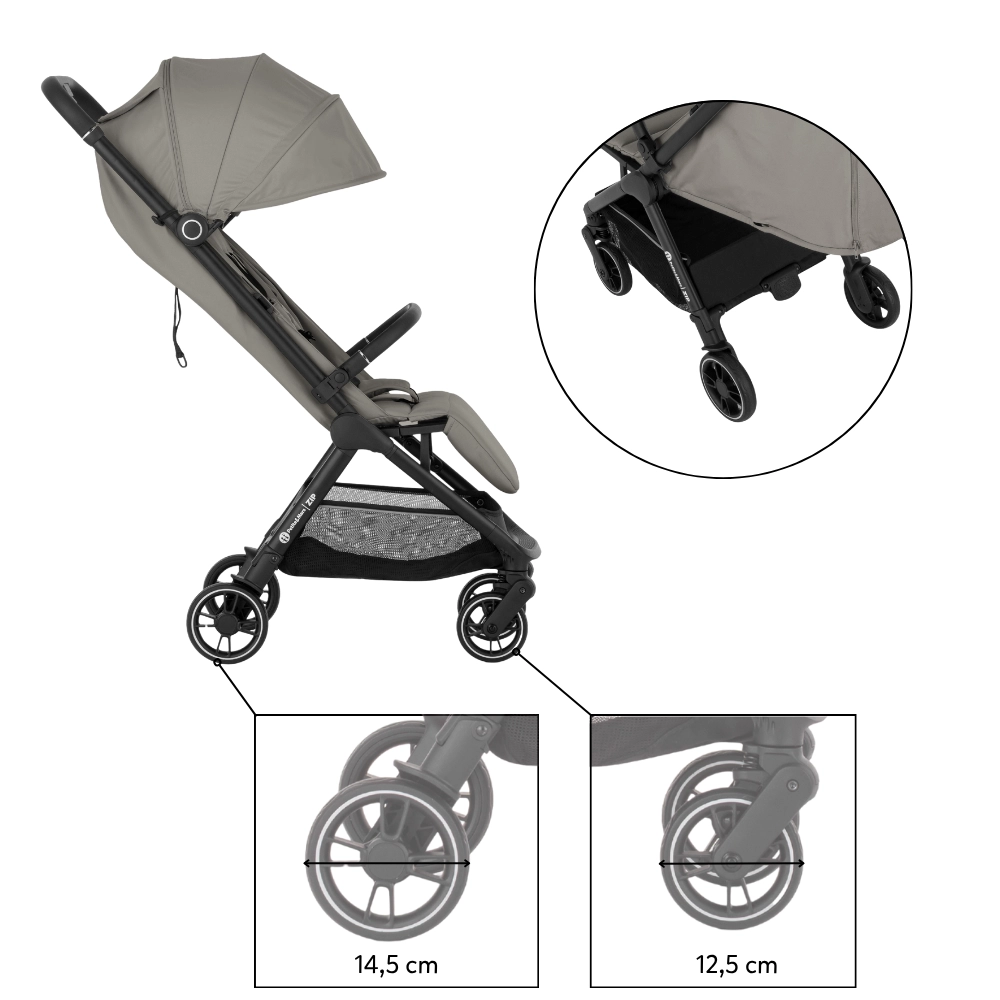 Les roues EVA avec suspension et le châssis compact facilitent la maniabilité sur trottoirs et allées de parc. Le frein à câble ne gêne pas la marche.