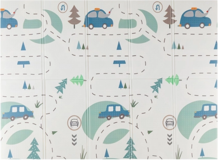 Des motifs ludiques avec routes, petites voitures et délicate arabesque stimulent l’imagination et le développement sensoriel lors des jeux du quotidien.