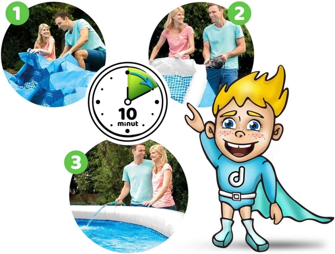 - Installation facile – déplier, gonfler l’anneau, remplir d’eau.