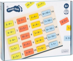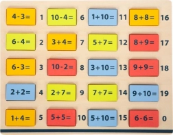 Les enfants s’exercent facilement aux bases de l’arithmétique grâce à une table clairement organisée et à des exercices lisibles sur des pièces en bois.