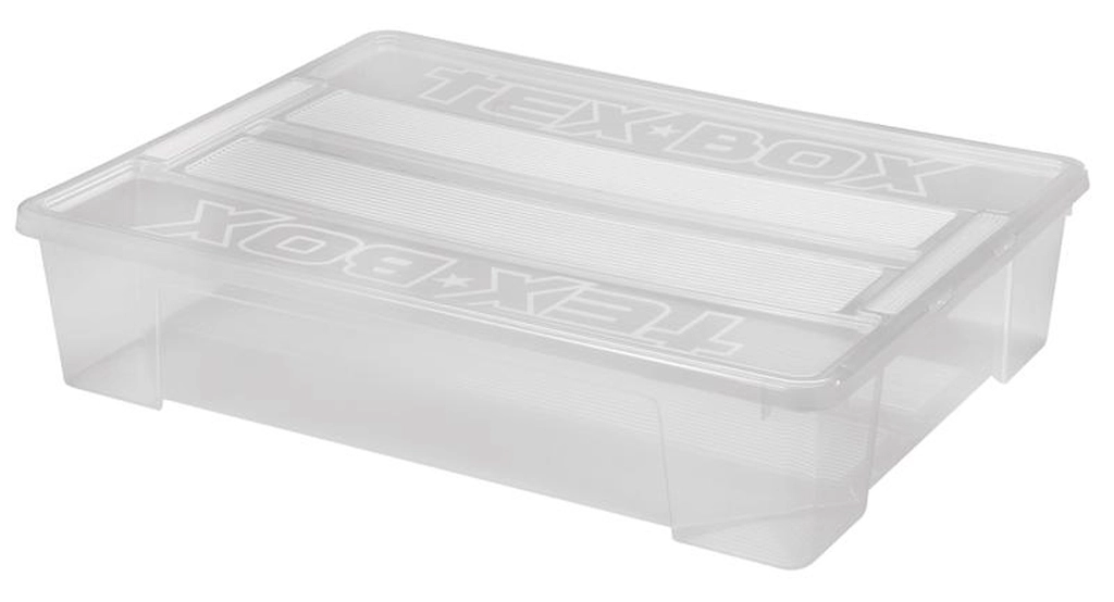 Spacieuse boîte de rangement en plastique HEIDRUN TexBox 60 l avec couvercle pratique pour garder vos affaires propres et en sécurité. Grâce à sa conception transparente, vous gardez toujours le contenu sous contrôle, que vous l’utilisiez à la maison, sous le lit, dans le garage, l’atelier ou le bureau. Elle protège de manière fiable contre la poussière, l’humidité et les dommages et est idéale pour les vêtements, jouets, couettes et accessoires saisonniers.