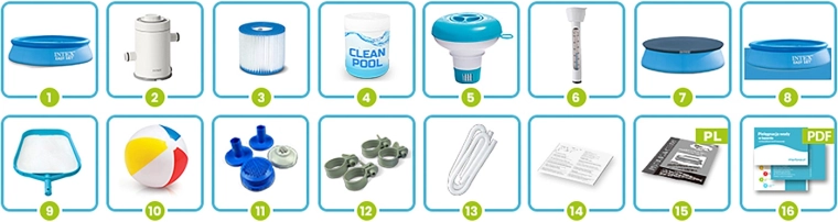 - Piscine, pompe de filtration, filtre H, multitablettes, doseur de produits chimiques avec thermomètre, bâche de couverture, tapis de sol, épuisette, tuyaux et colliers, paniers d’aspiration, ballon de plage, manuel, rustine de réparation