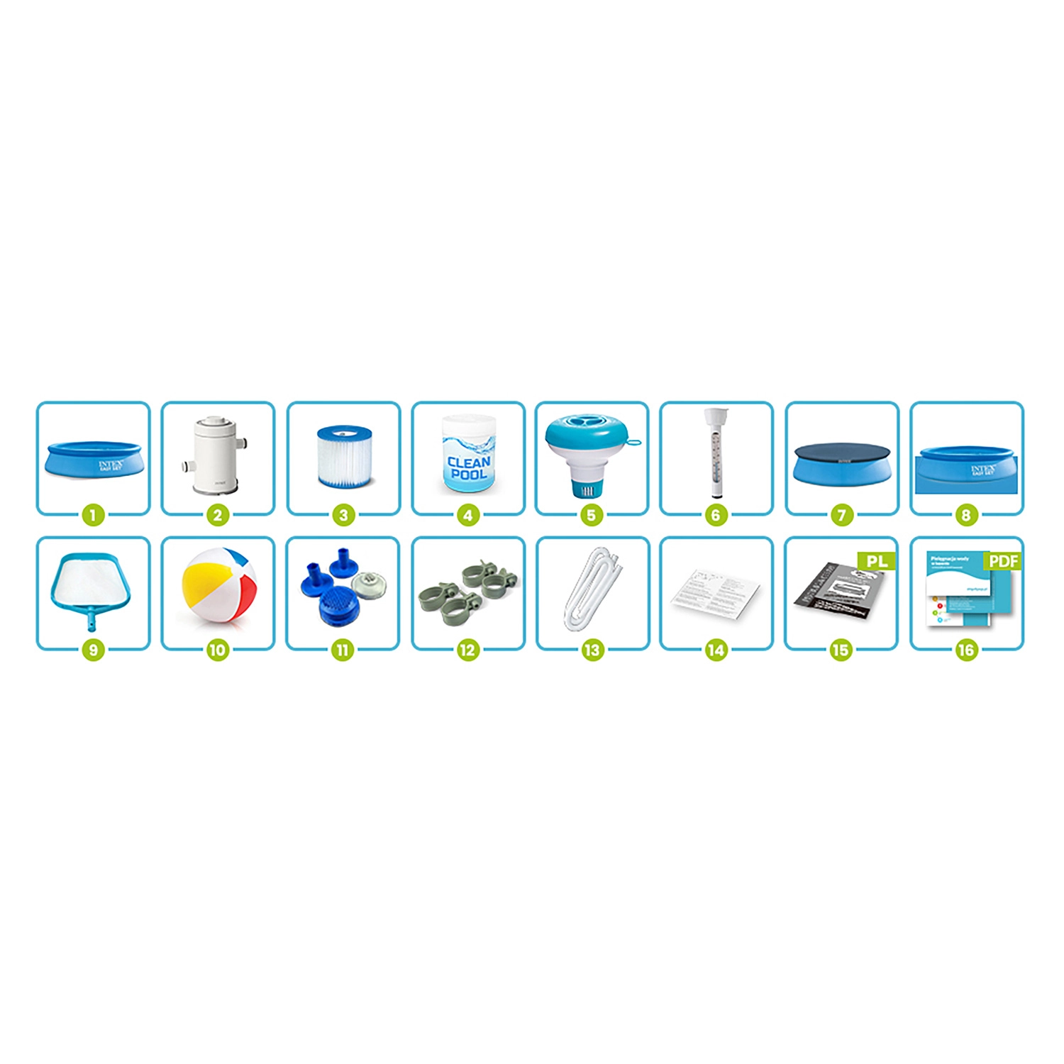 Dans la boîte, vous trouverez tout : piscine, pompe à cartouche avec filtre H, multitablettes, doseur avec thermomètre, bâche de couverture, tapis de sol, épuisette, tuyaux, colliers, paniers d’aspiration, manuel, rustine de réparation et ballon de plage. Démarrage facile sans achats supplémentaires.