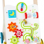 Le déambulateur est équipé de roues dentées rotatives, de hiboux et d'un labyrinthe coloré pour développer la motricité fine.
