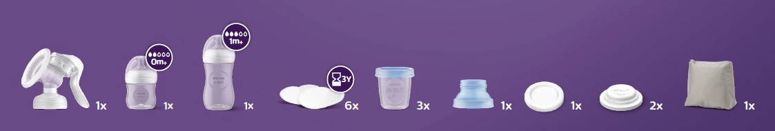 - Tire-lait manuel avec capuchon de col (1×), biberon 125 ml avec tétine 0m+ (1×), biberon 260 ml avec tétine à débit 1m+ (1×), coussinets d’allaitement jetables (6×), pochette isotherme (1×), couvercle d’étanchéité (1×), gobelets VIA avec couvercle (3×), adaptateur VIA (1×)