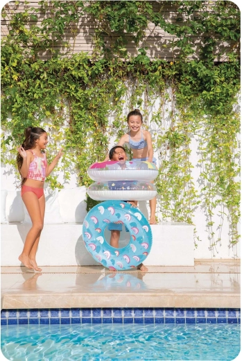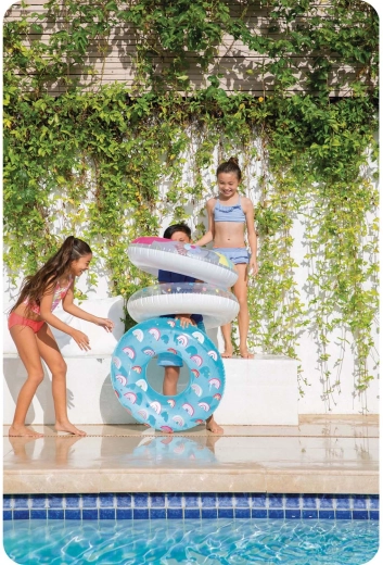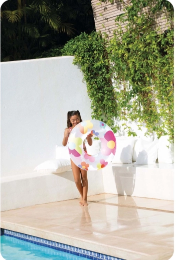 Une valve pratique permet un gonflage et un dégonflage rapides. La surface PVC brillante s’essuie facilement et reste propre même après une journée entière à la piscine.
