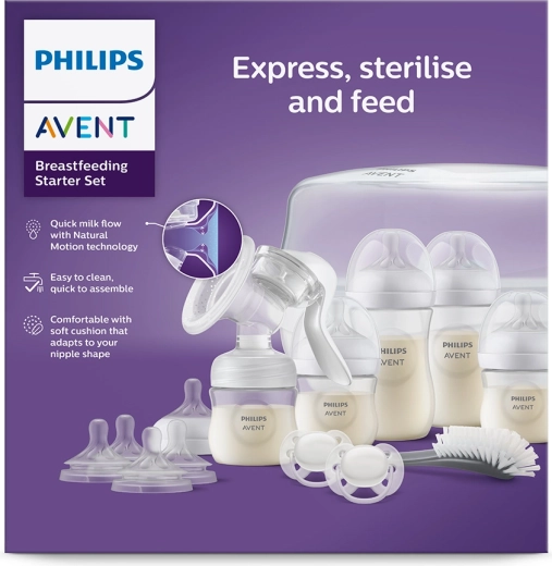 Solution complète pour l’allaitement : stérilisez, tirez et nourrissez avec un seul kit pratique. Tire‑lait manuel avec technologie Natural Motion pour un rythme de succion naturel, stérilisateur vapeur pour micro‑ondes qui élimine 99,9 % des bactéries en 2 minutes, et biberons Philips Avent Natural avec tétine en forme de sein pour faciliter l’alternance sein/biberon. Le coffret comprend aussi des sucettes Ultrasoft ultra‑douces et tous les accessoires nécessaires pour prendre soin de bébé à la maison comme en déplacement.