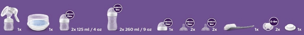 Contenu de la boîte : 1× tire‑lait manuel; 1× stérilisateur micro‑ondes; 2× sucette Ultrasoft 0–6 m; 2× tétine 0 m+; 2× tétine 1 m+; 2× biberon 260 ml; 2× biberon 125 ml; 1× goupillon pour biberons.