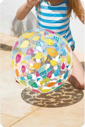 Le ballon transparent avec des poissons colorés est parfaitement visible à la piscine comme sur la plage et donne envie de jouer aux enfants comme aux adultes.