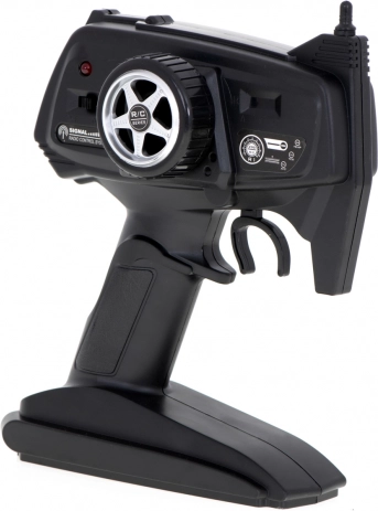 Un émetteur 2,4 GHz est inclus pour un contrôle stable et sans interférences. Le modèle est alimenté par un accumulateur, la radiocommande nécessite 4× AA 1,5 V. Les dimensions 48 × 27 × 25 cm offrent un excellent compromis entre agilité et franchissement.