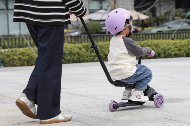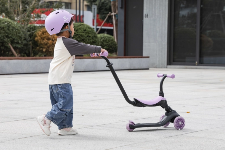 - 3-en-1 – conduite assise, avec assistance parentale, trottinette autonome.