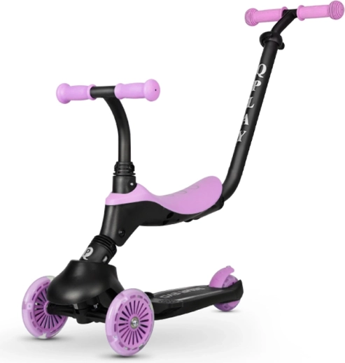 Trottinette et draisienne pour enfants polyvalente Qplay Sema Evo 3-en-1 qui grandit avec votre enfant de 12 mois jusqu’à 50 kg. Elle offre un châssis tricycle stable, des roues avant LED, une sellette amovible et une poignée parentale réglable en hauteur pour un guidage sécurisé. Grâce au mécanisme de poussée et de direction, au système pliant et au frein arrière, elle est idéale pour apprendre l’équilibre comme pour rouler en autonomie.