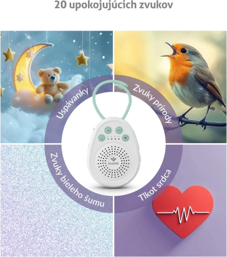 - 20 sons pour un endormissement apaisé : 5 mélodies, 9 sons de la nature, 5 bruits blancs et 1 battement de cœur.