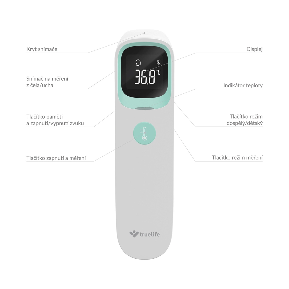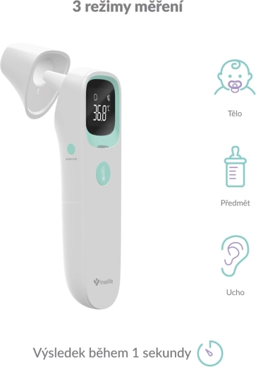 Mesure rapide et hygiénique sans contact en une seconde. TRUELIFE Care Q9 offre 3 modes (front, oreille, objets/liquides), une précision de ±0,1 °C, un indicateur coloré de fièvre, une mémoire de 20 mesures et une autonomie jusqu’à 20 000 mesures. Vous apprécierez la commande simple à un seul bouton et l’écran LCD rétroéclairé à la maison comme en voyage.